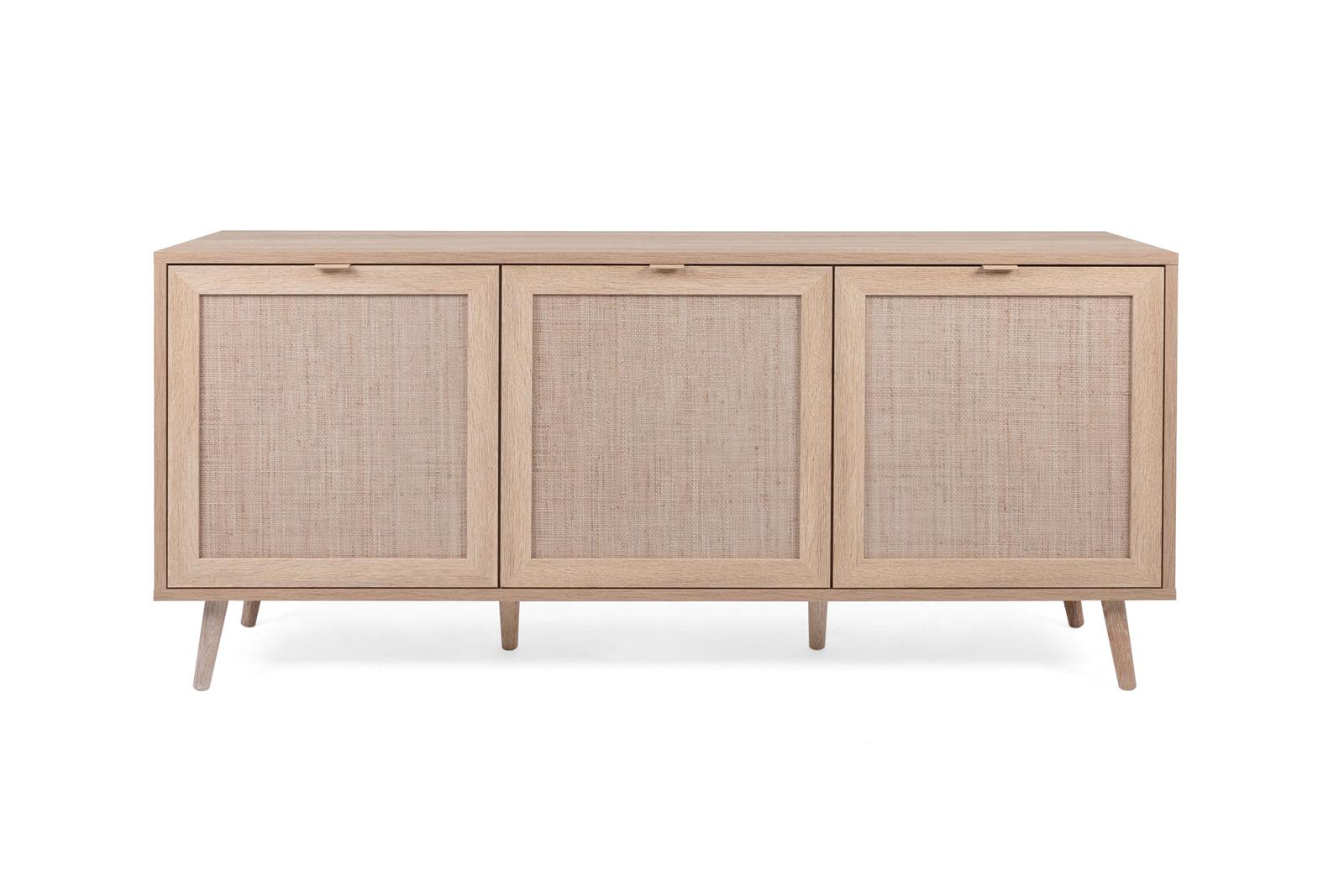Die Korpuskonstruktion aus Spanplatte wird durch Füße aus Massivholz getragen, die in konischer Form den typischen skandinavischen Charakter unterstreichen. Praktische Griffleisten aus Kunststoff erleichtern das Öffnen der Türen und fügen sich unauffällig in das Gesamtbild ein.