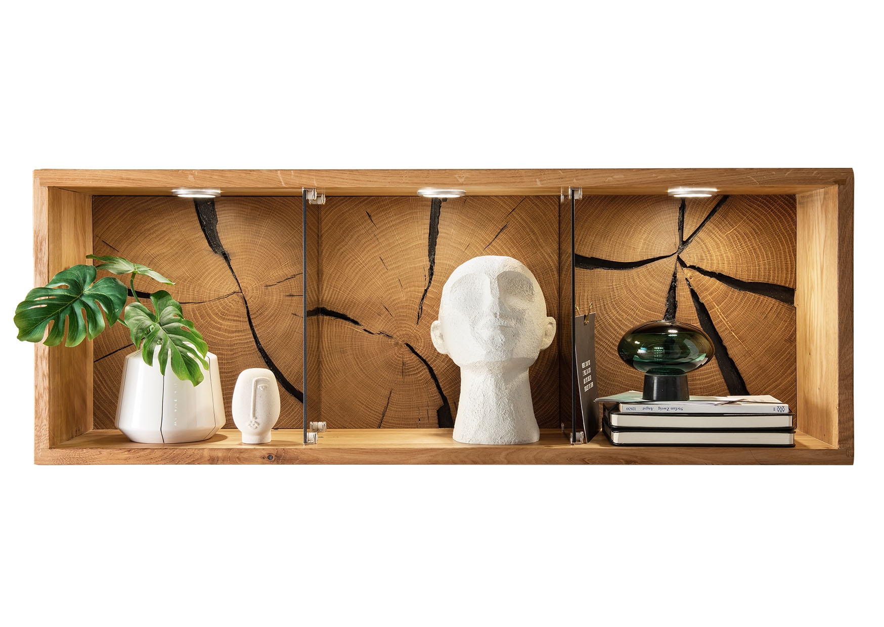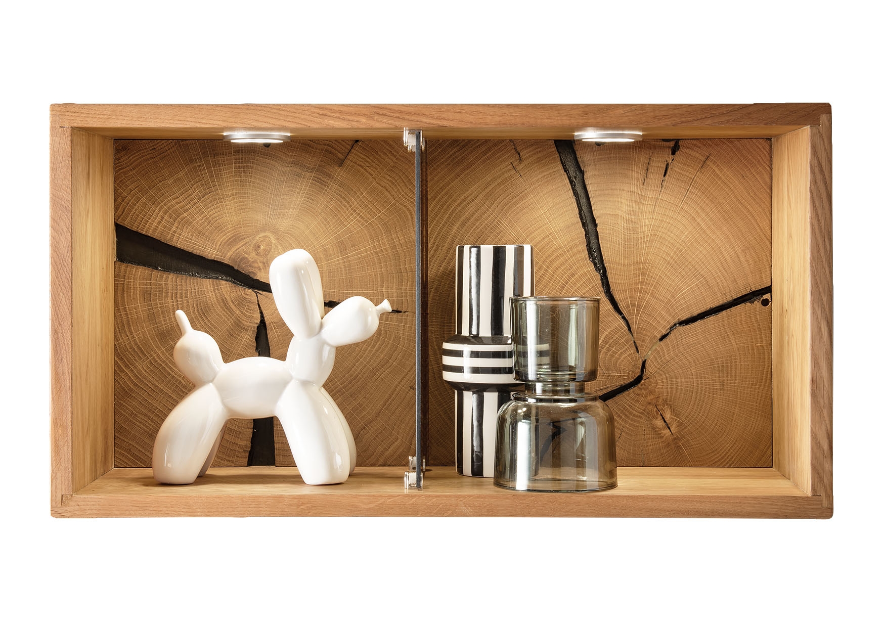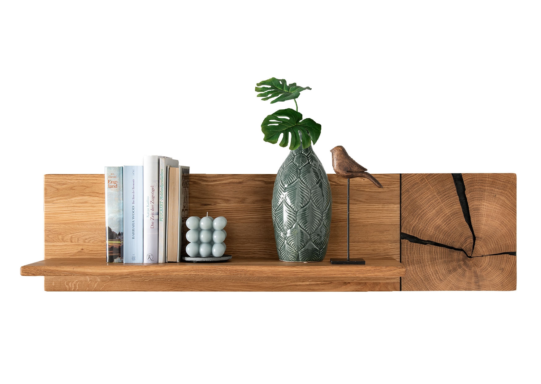 Die geölte Wildeiche mit Hirnholzelementen betont Maserung und Wachstumsringe für eine warme Ausstrahlung.