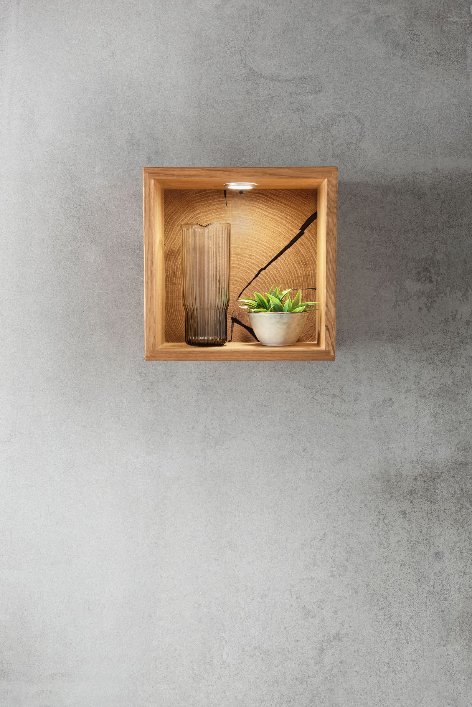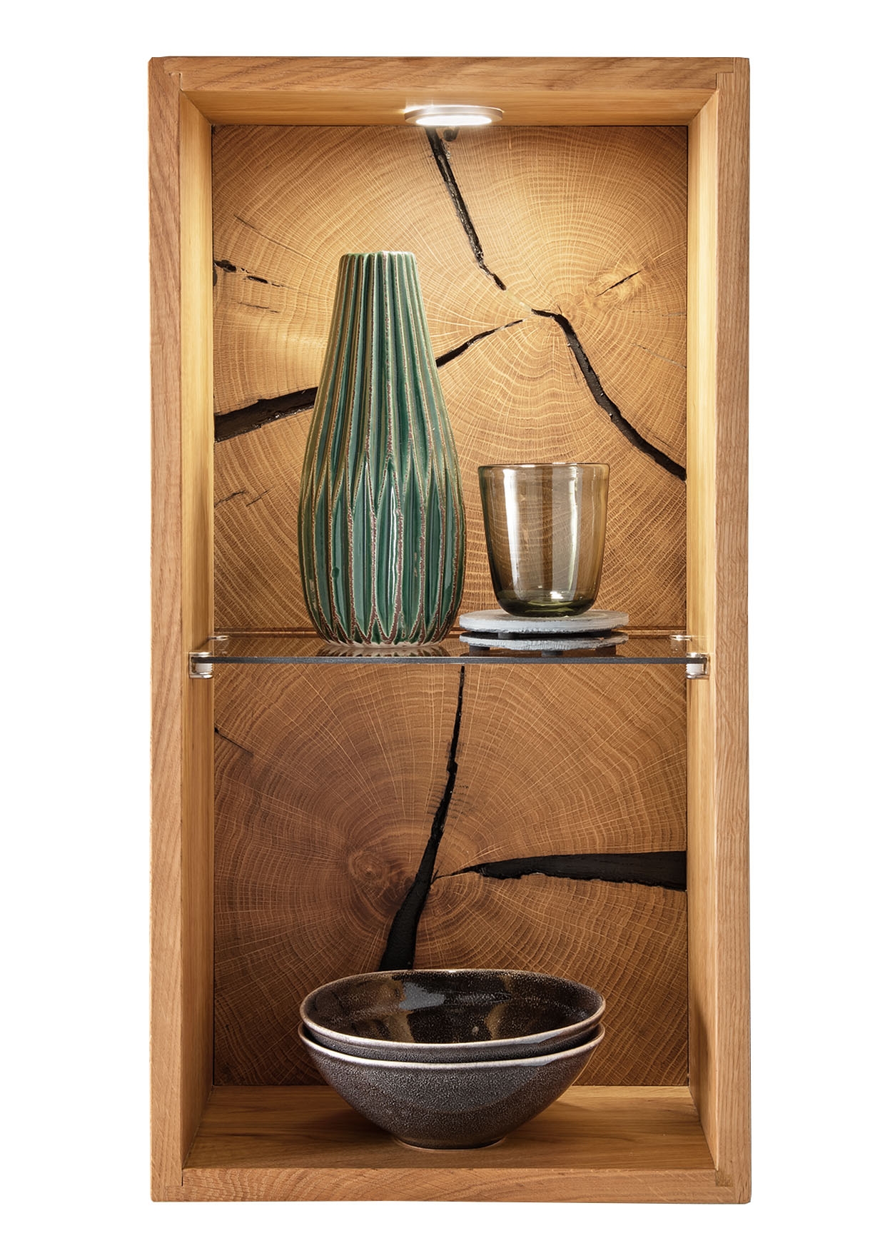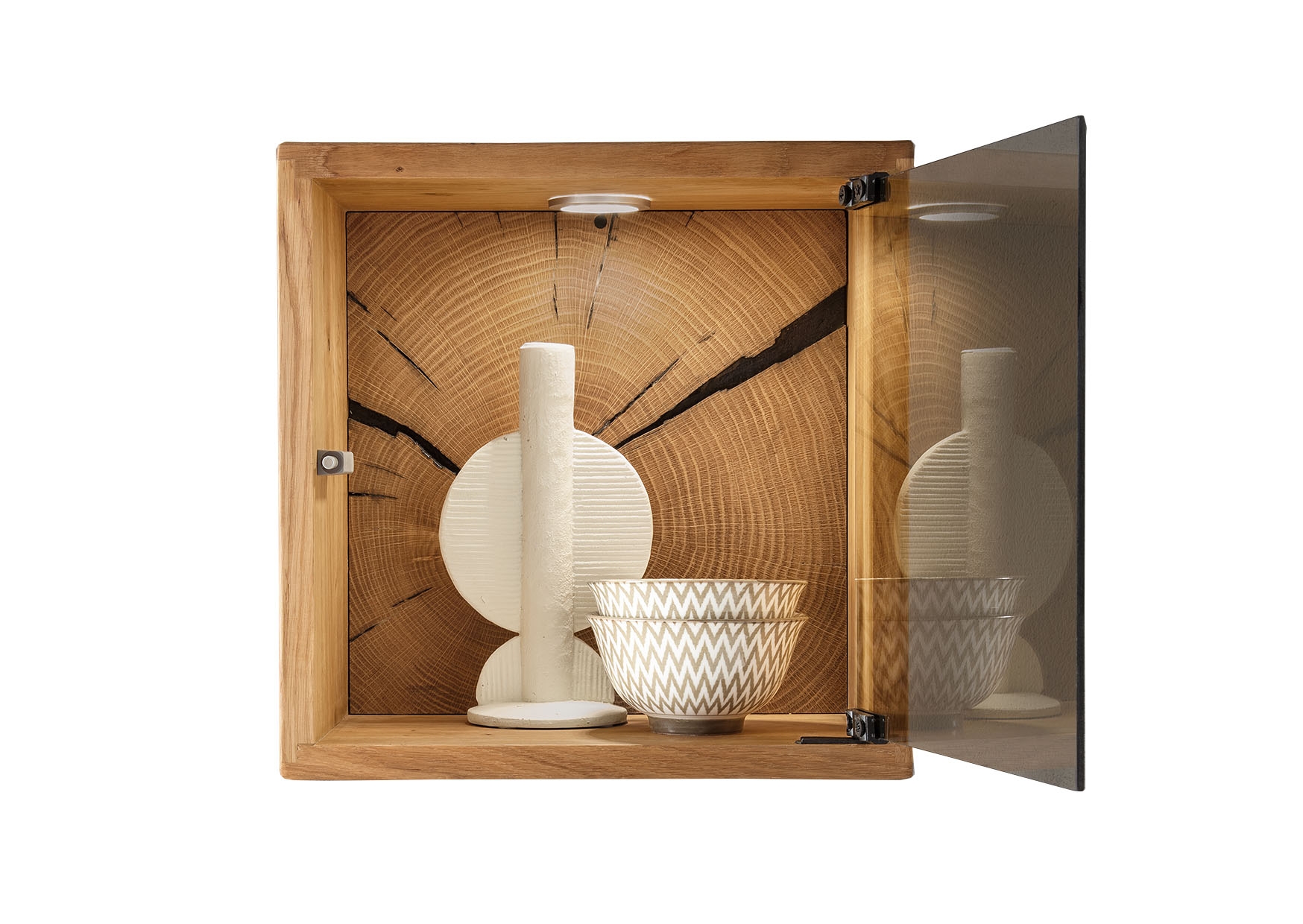 Die geölte Wildeiche mit Hirnholzelementen betont Maserung und Wachstumsringe für eine warme Ausstrahlung.