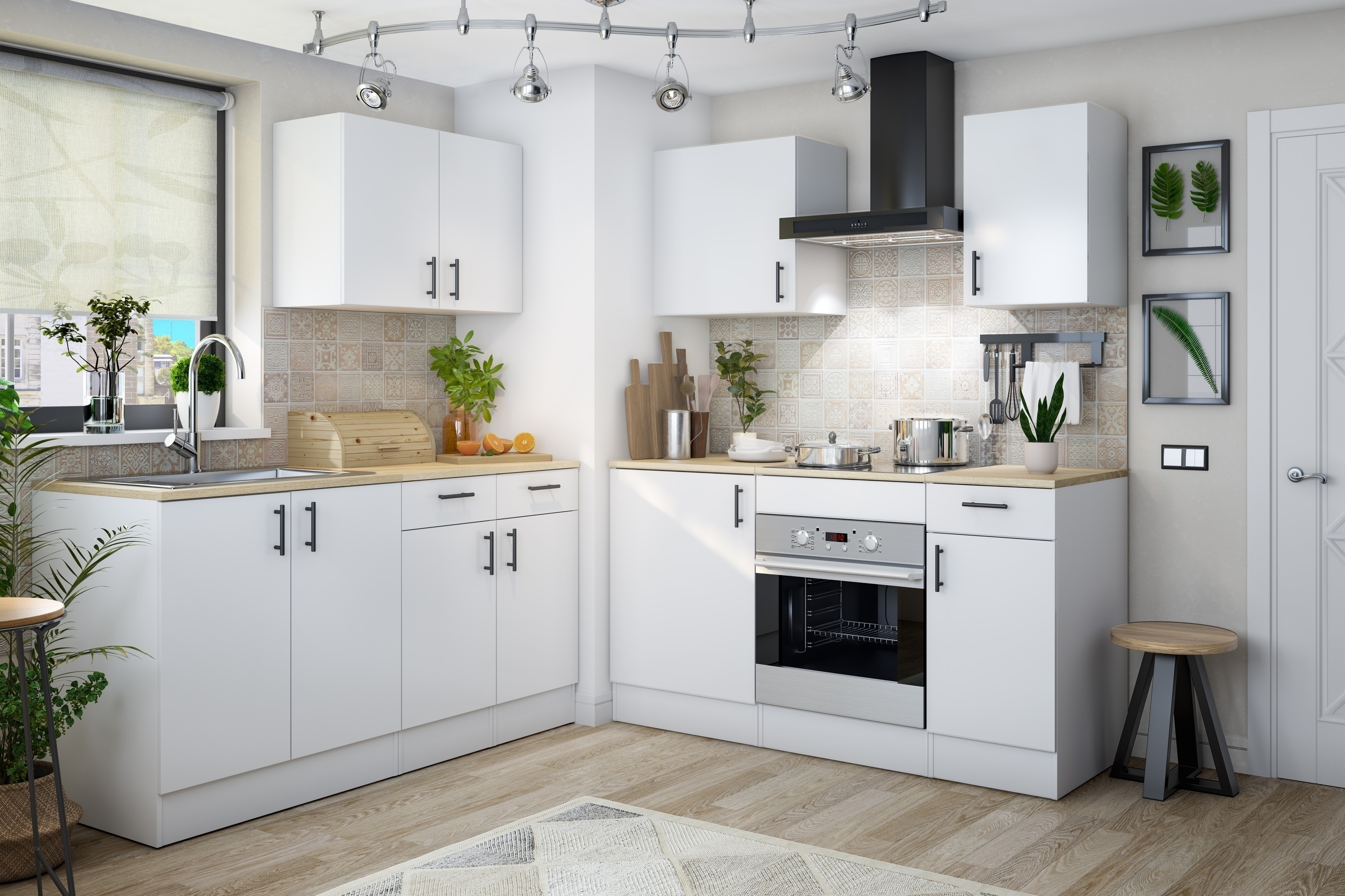 Für eine saubere Ausrichtung und einen sicheren Stand sorgen vier höhenverstellbare Füße, die Unebenheiten im Boden ausgleichen. Mitgelieferte Verbindungsstücke ermöglichen es zudem, verschiedene KIRA-Module zu einer individuell geplanten Küchenzeile zu kombinieren. Die Rückwand aus 3 mm starkem MDF/DM in Weiß fügt sich unauffällig ins Gesamtbild ein.