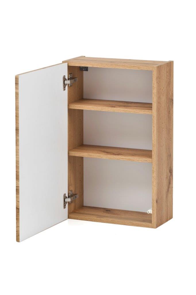 Der Korpus besteht aus melaminharzbeschichteter Spanplatte, die Front aus MDF in Wotaneiche. Diese Materialkombination steht für pflegeleichte, langlebige Oberflächen und eine wertige Optik. Die grifflosen Fronten unterstreichen den geradlinigen Charakter des Schranks und sorgen für ein ruhiges Gesamtbild. Mit einer Drehtür, einem Schubkasten und einem Einlegeboden steht Ihnen gut strukturierter Stauraum für Badutensilien, Handtücher oder andere Alltagsgegenstände zur Verfügung.