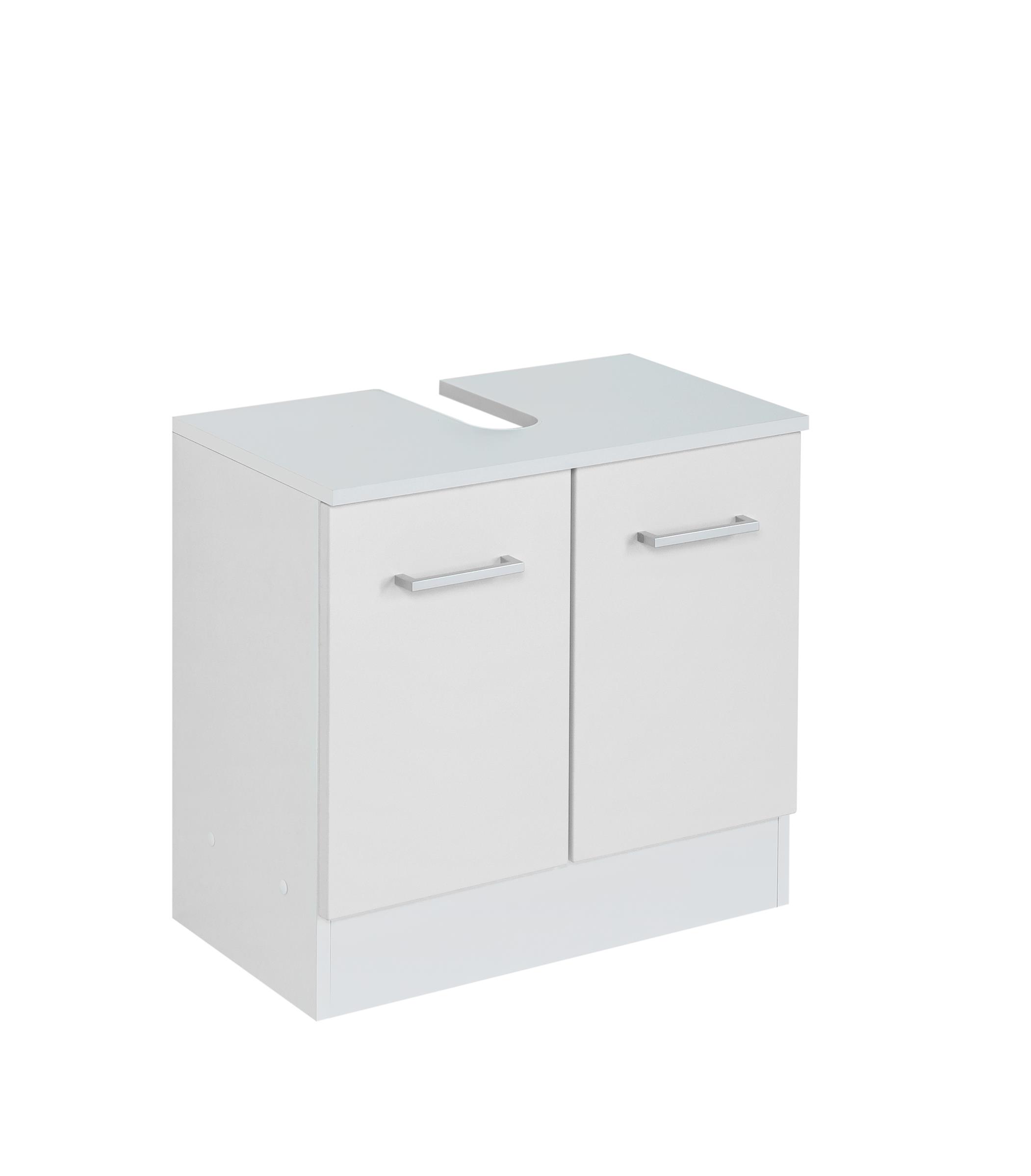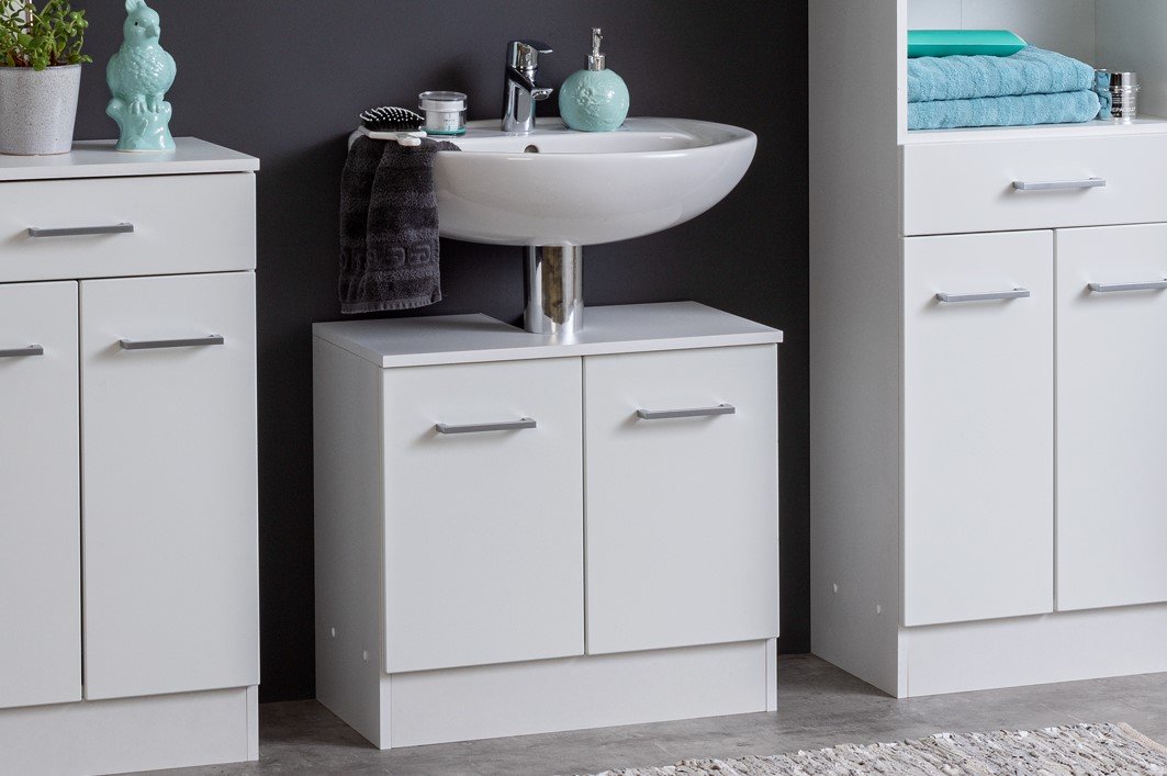 Gestaltet im modernen Wohnstil überzeugt der Schrank mit einem weißen Korpus aus melaminharzbeschichteter Spanplatte und einer weiß-matten Front aus MDF. Die folierte Oberfläche und der Bügelgriff in Edelstahl-Optik unterstreichen das zeitlose, klare Design, das sich leicht mit vorhandenen Badmöbeln kombinieren lässt.