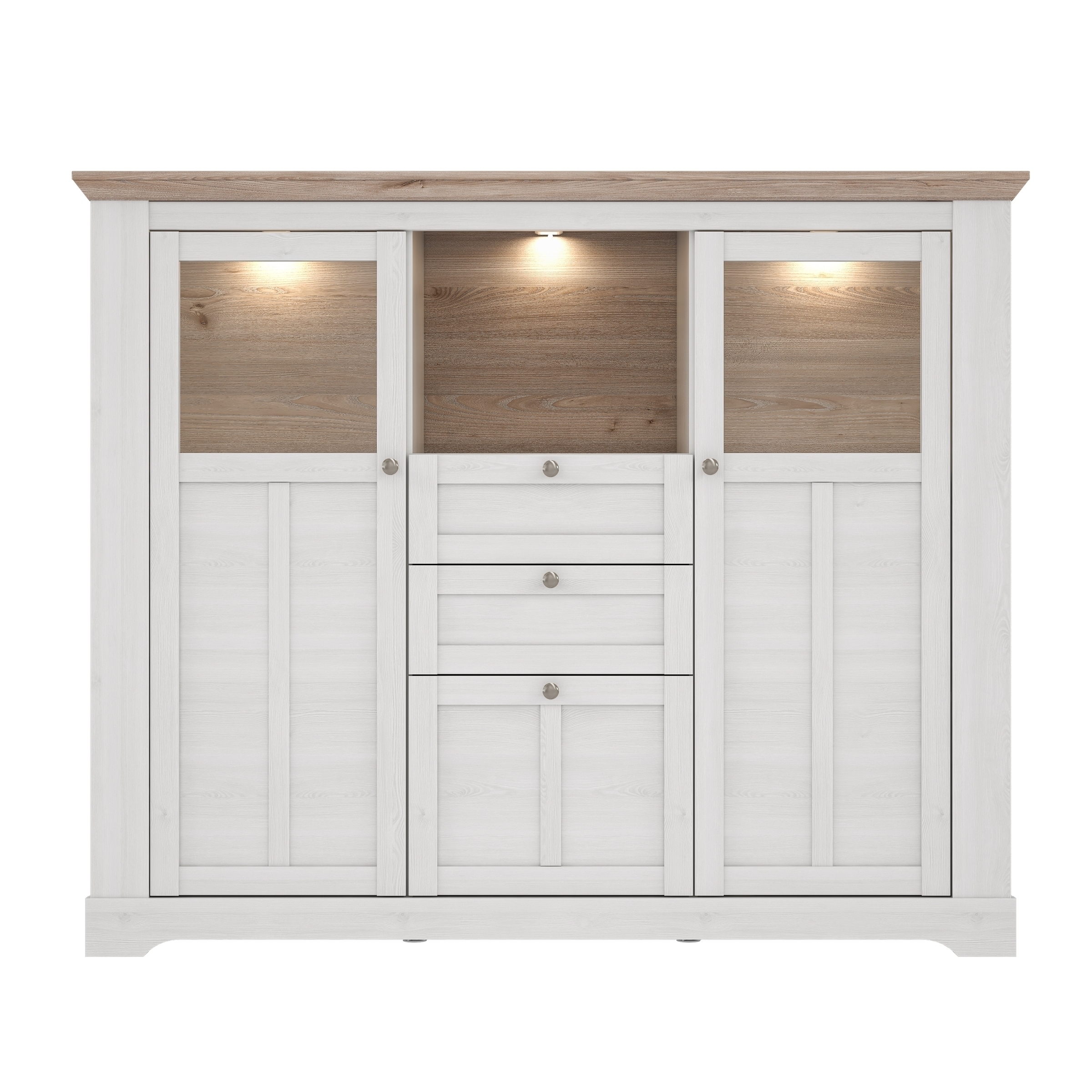Der harmonische Material- und Farbmix aus Schnee Eiche und Nelson Eiche, kombiniert mit der Folie finish Beschichtung, verleiht der Vitrine eine zeitlose Optik. Die teilweise verglasten Drehtüren rücken Ihre Lieblingsstücke ins Blickfeld, während die integrierte LED-Beleuchtung für eine moderne, stimmungsvolle Lichtatmosphäre sorgt.