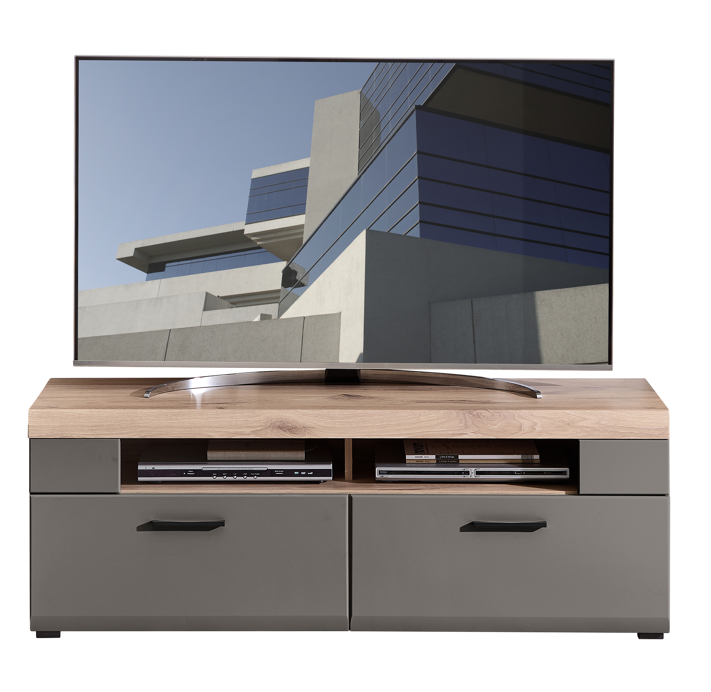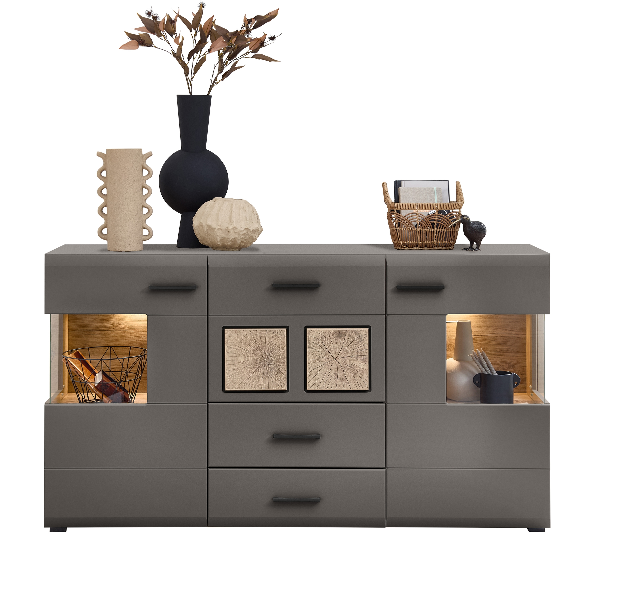 Gestaltet in der Grundfarbe Basalt und veredelt durch Absetzungen in Hirnholz Nachbildung sowie eine Rückwand in Eiche Altholz Nachbildung, wirkt das Möbelstück zugleich modern und wohnlich. Der Korpus besteht aus Spanplatte, die Front aus MDF, während Metallgriffe in chrom matt und Kunststofffüße das Gesamtbild abrunden. Klarglaselemente sorgen dafür, dass dekorative Inhalte gut sichtbar bleiben.