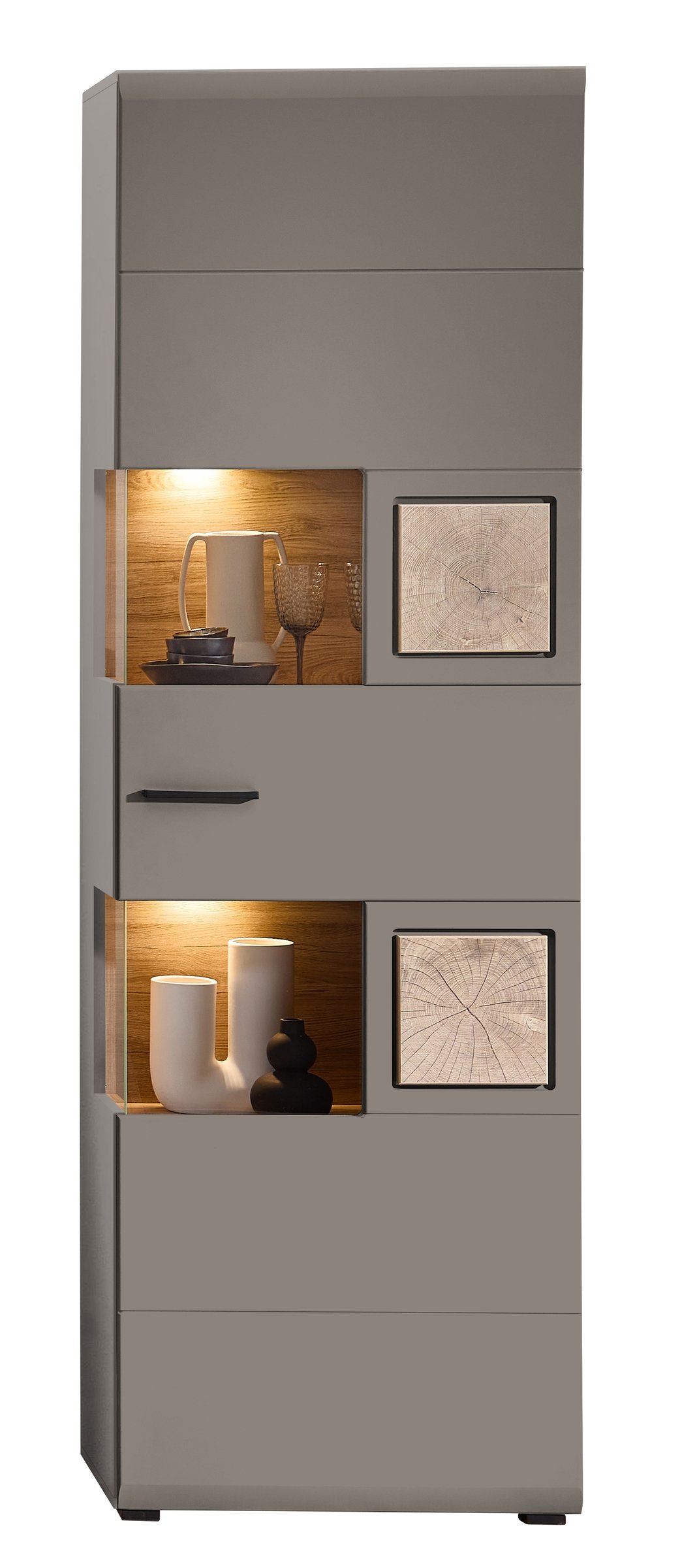 [metaDescription] => Moderne Vitrine in Basalt, Korpus aus Spanpatte, Front aus MDF mit Absetzungen aus Spanplatte in Hirnholz Nachbildung mit 1 Glas-/Holztür, 1 Holztür, 4 Kons