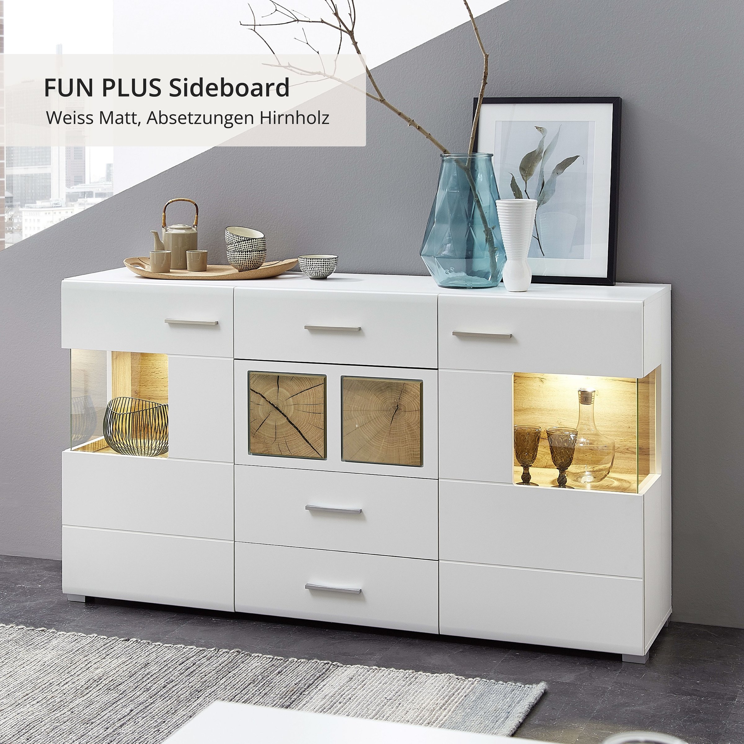 Besonders wirkungsvoll: die integrierte LED-Schrankbeleuchtung mit warmweißer Lichtfarbe. Sie setzt den vitrinenartigen Bereich stilvoll in Szene und schafft eine behagliche Atmosphäre im Ess- oder Wohnzimmer. Die Glas-/Holztür sorgt dabei für Durchblick und macht die präsentierten Objekte zum Blickfang, während sie zugleich vor Staub geschützt sind.