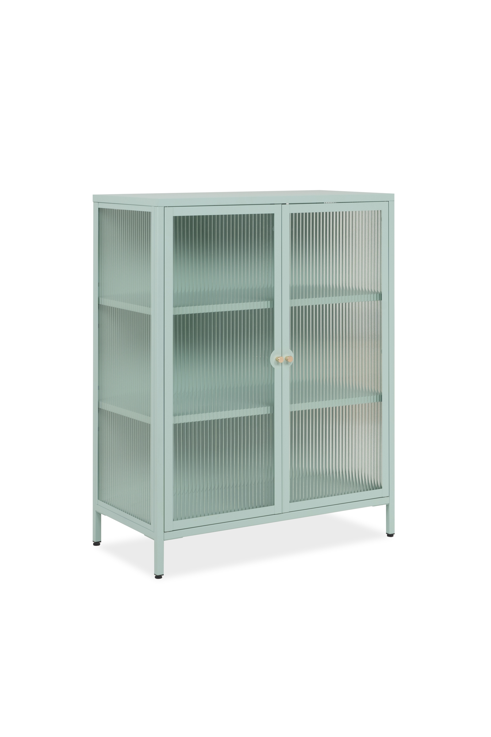 Der Korpus aus Stahl in einem frischen Mintgrün sorgt für eine moderne, leichte Optik und passt hervorragend zu zeitgemäßen Einrichtungsstilen. Die goldfarbenen Knopfgriffe setzen einen eleganten Akzent und runden das Gesamtbild harmonisch ab. Die vier Innenfächer mit drei Einlegeböden aus Stahl bieten flexible Stellflächen für Geschirr, Gläser, Bücher oder dekorative Objekte.