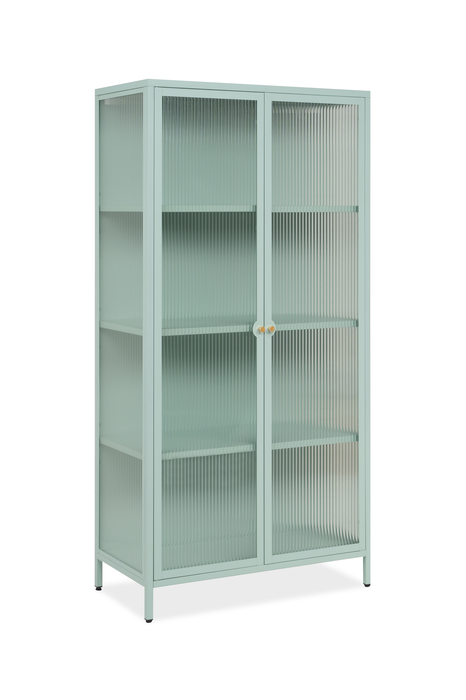 Gefertigt aus robustem Stahl in Mintgrün steht die Vitrine sicher und langlebig in Ihrem Zuhause.