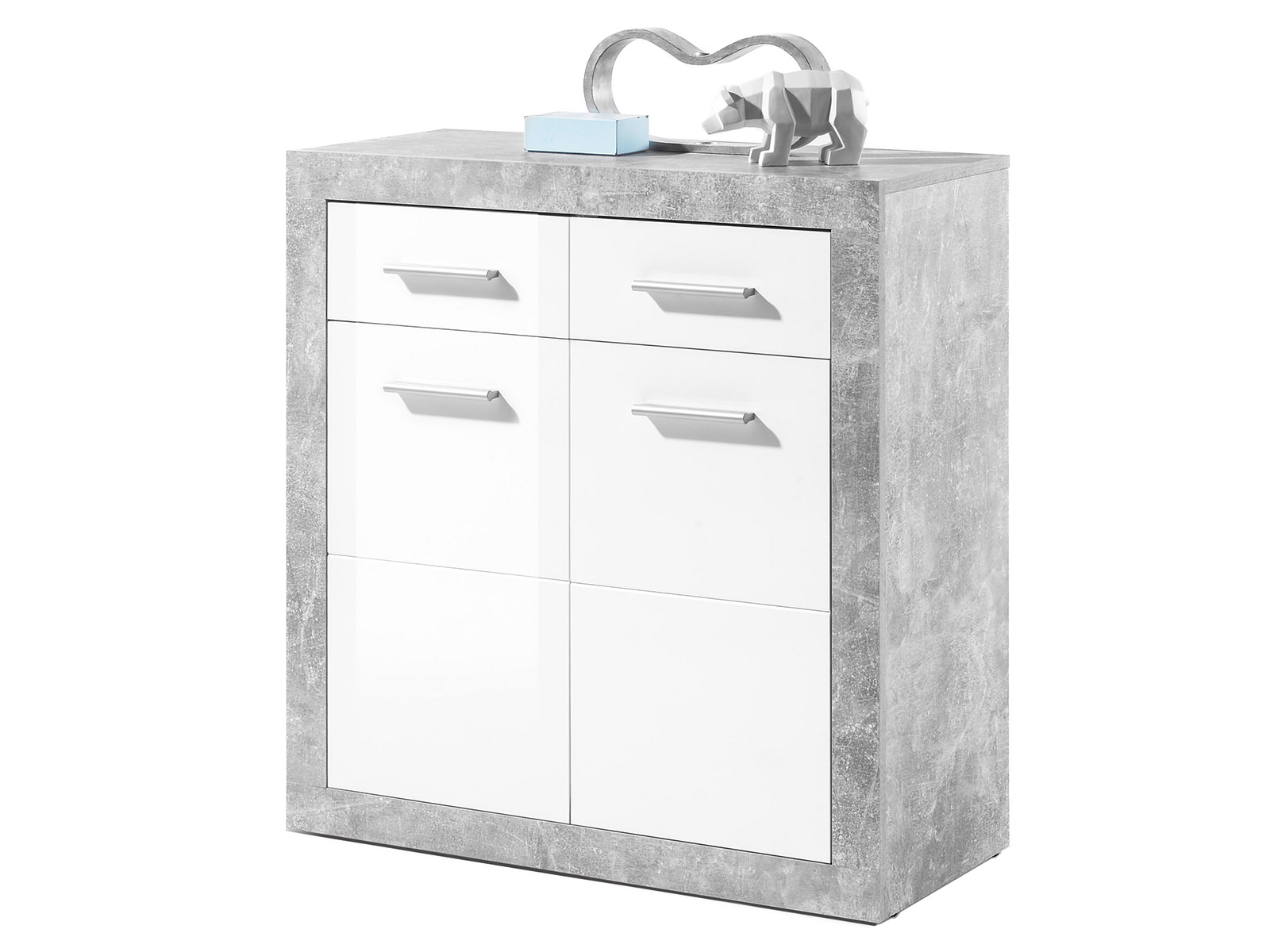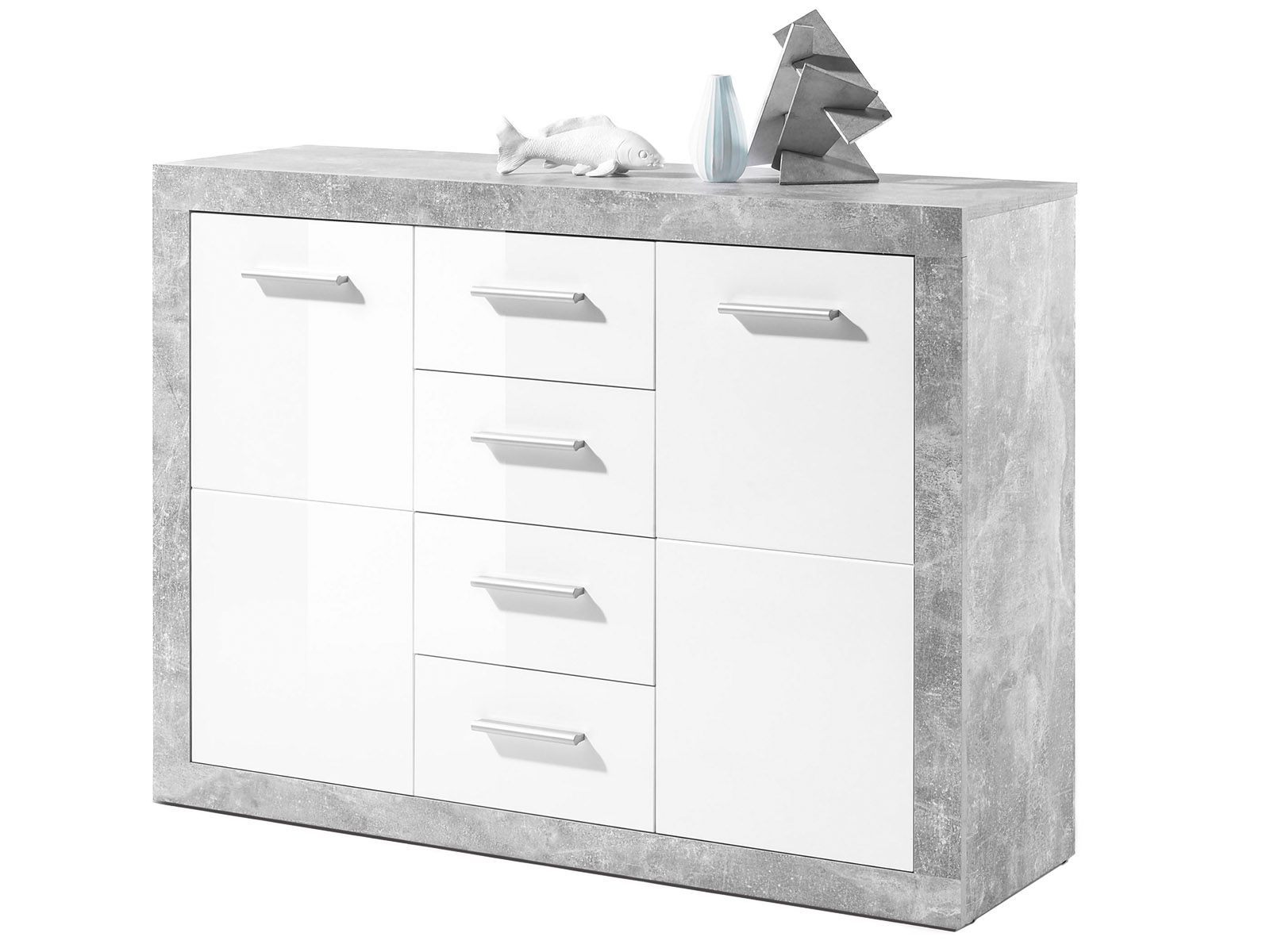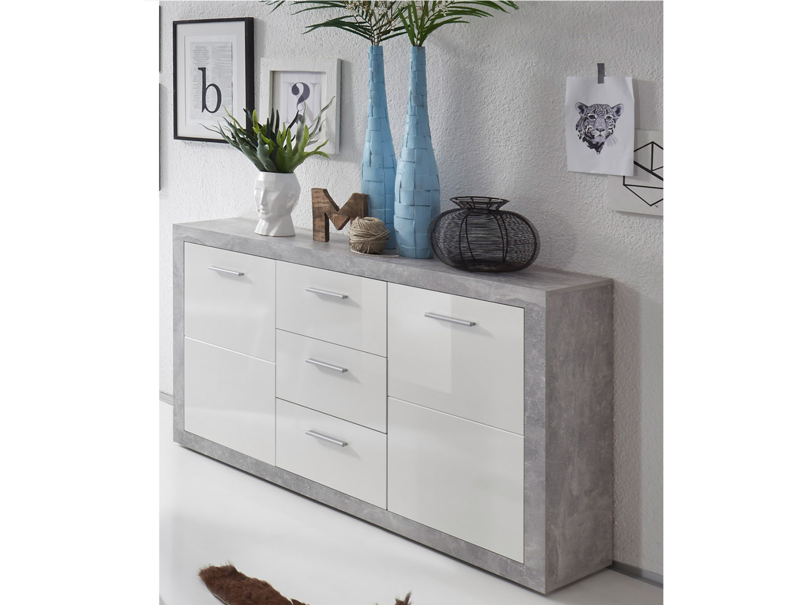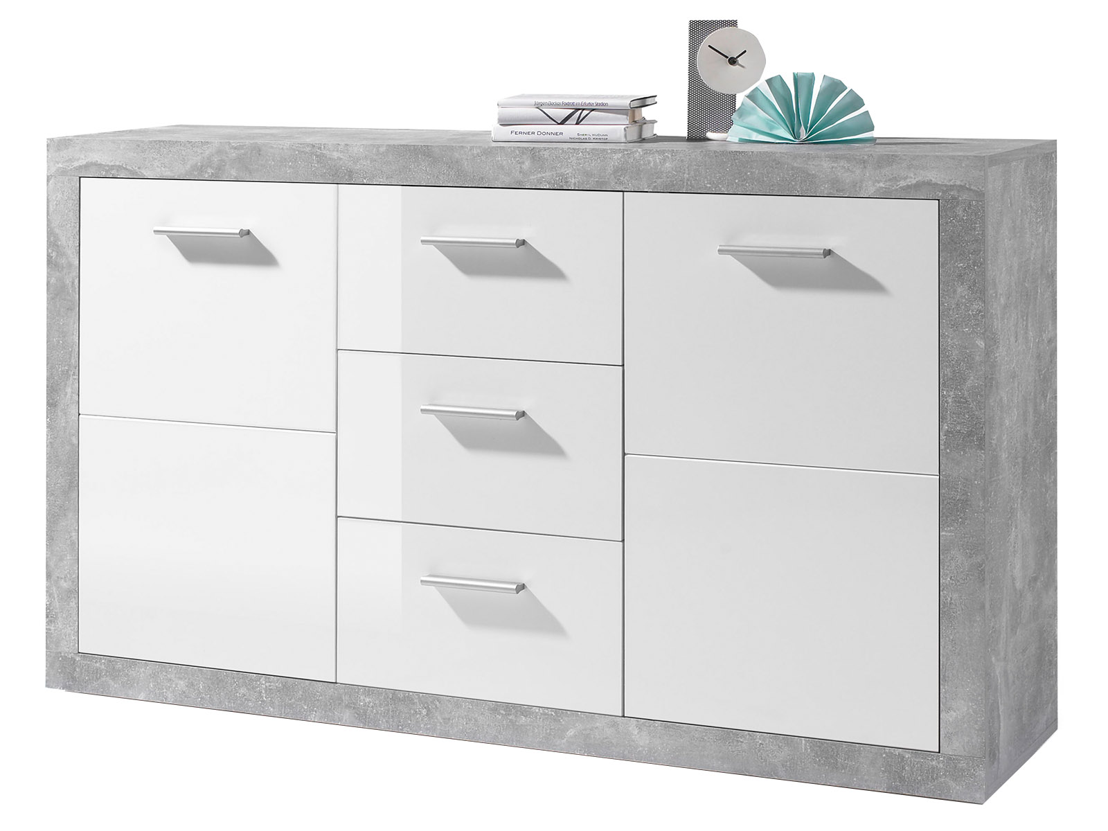 [BulletPoints] => TV-Lowboard aus Spanplatte, Korpus/Frontrahmen in Beton Nachbildung und Front in Weiß-Glanz mit 3 Schubkästen und 3 offene Fächer;Breite 147 cm, Höhe 49 cm, Tiefe 45 cm ;Pflegeleichte Oberflächen;Made in Europe