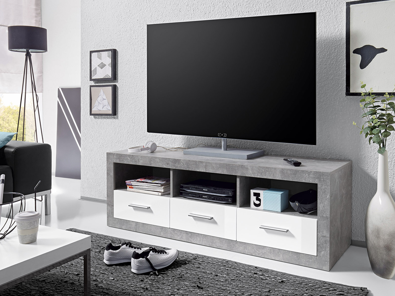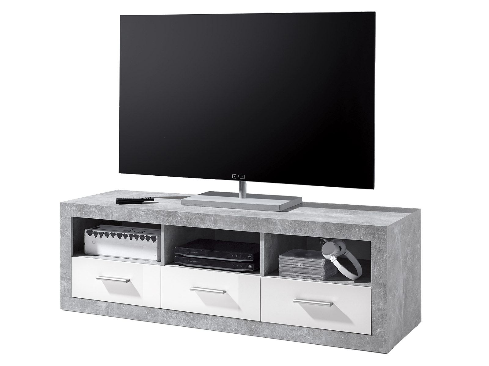 [metaDescription] => TV-Lowboard aus Spanplatte, Korpus/Frontrahmen in Beton Nachbildung und Front in Weiß-Glanz mit 3 Schubkästen und 3 offene Fächer Breite 147 cm, Höhe 49 cm,