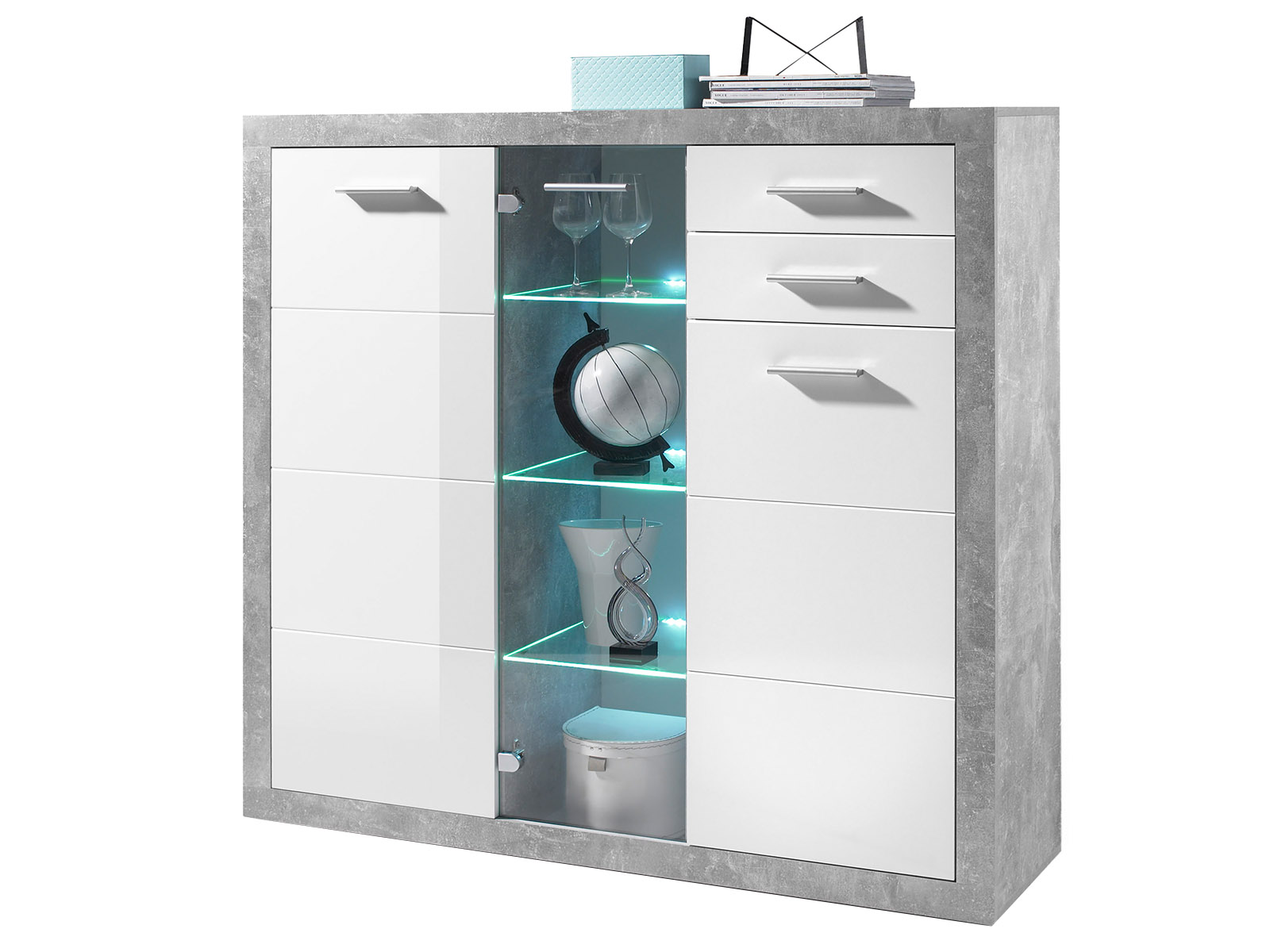 Mit integrierter LED-Beleuchtung setzt die Vitrine Ihre Exponate effektvoll in Szene – ob als dezente Hintergrundbeleuchtung oder als stilvolles Highlight. Die Kombination aus Betonoptik am Korpus und weißen Glanzfronten verleiht dem Möbelstück einen modernen, urbanen Look, der sich harmonisch in jedes zeitgemäße Wohnambiente einfügt.