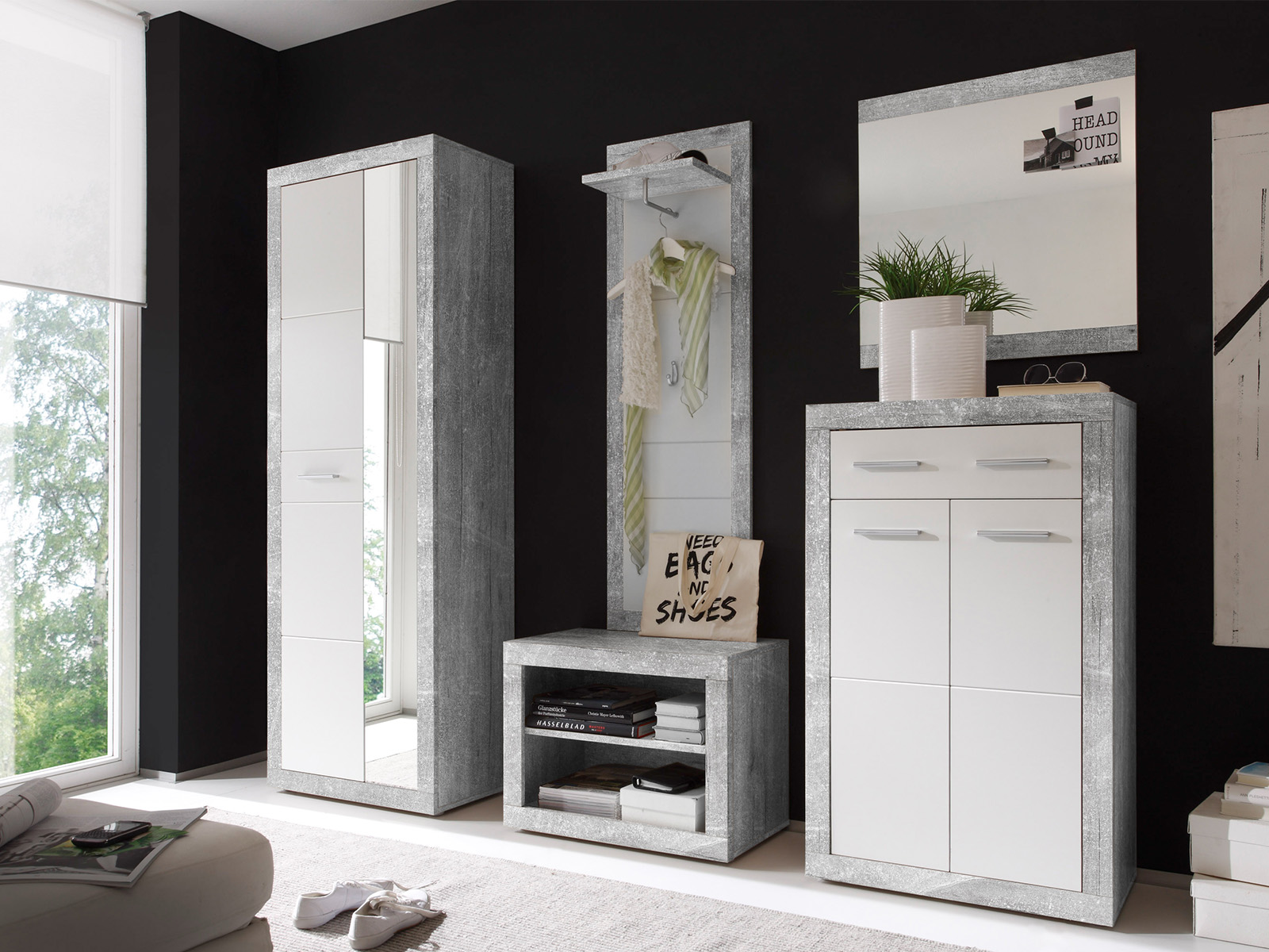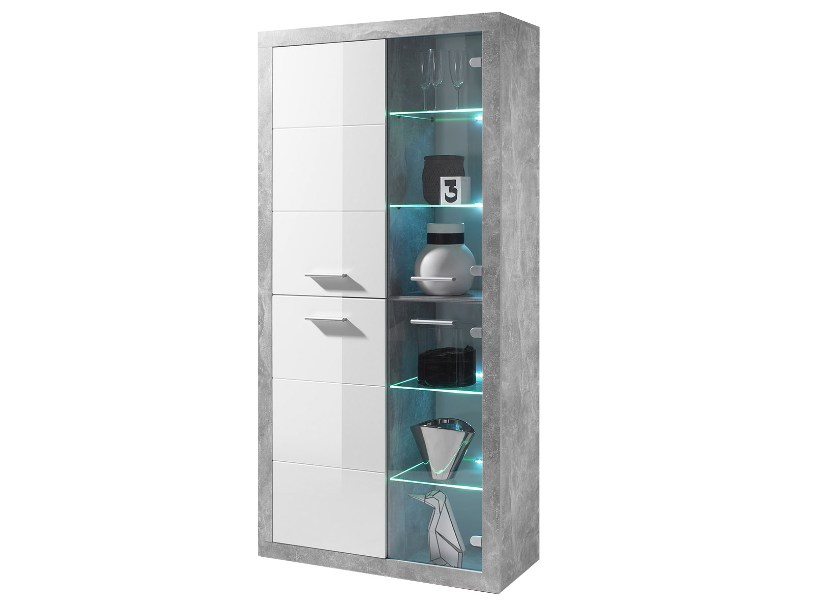 [metaDescription] => Vitrine aus Spanplatte, Korpus in Beton Nachbildung, Front Weiß-Glanz mit 2 Glastüren, 2 Holztüren, 4 Einlegeböden und 4 Glasböden, inkl LED-Beleuchtung Bre