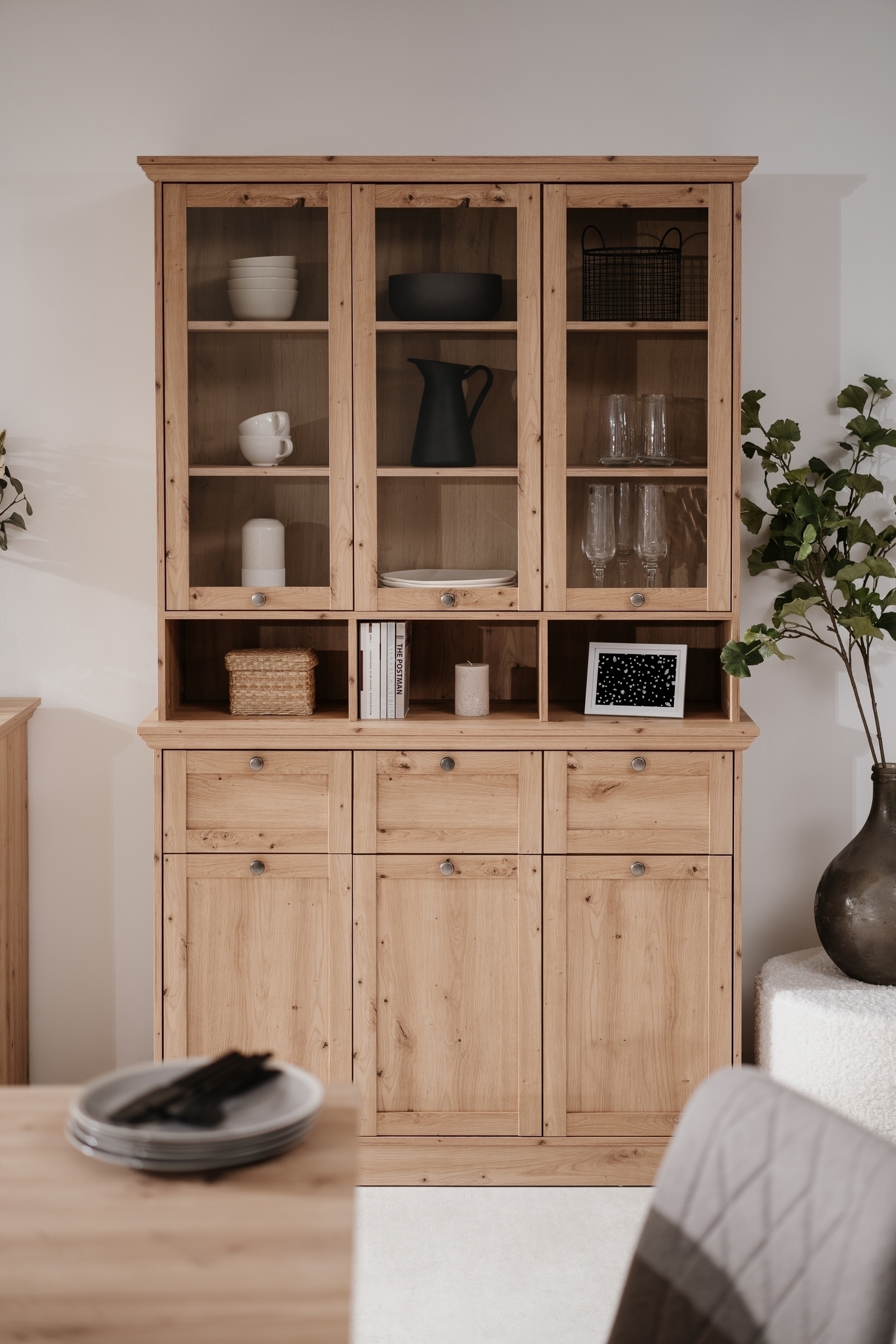 Ob als Geschirrschrank im Esszimmer, als Stauraummöbel in der Wohnküche oder als dekorative Standvitrine im Wohnzimmer – mit der Vitrine "Timber" entscheiden Sie sich für ein vielseitig nutzbares Möbelstück, das Stauraum, Präsentationsfläche und behagliches Design miteinander verbindet.