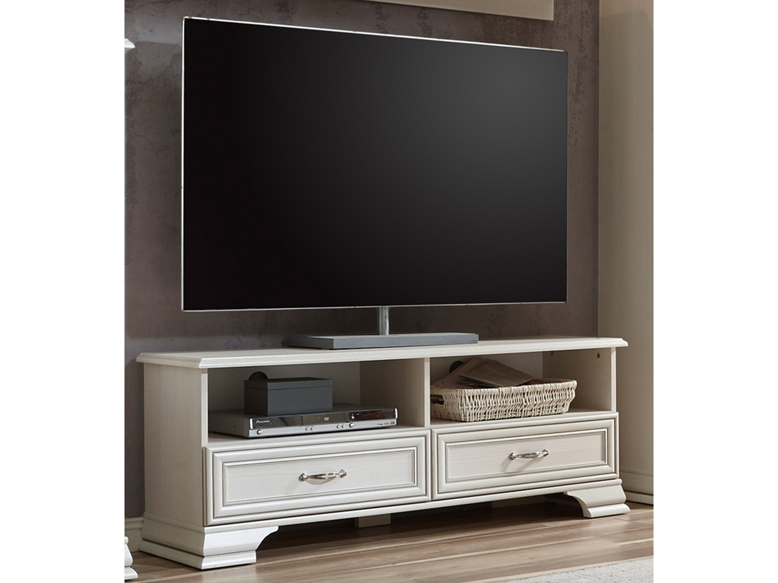 [cWert] => TV-Lowboard im Landhausstil;aus Spanplatte;in Used White;mit 2 Schubkästen und 2 offenen Fächern;Breite 130 cm, Höhe 51 cm, Tiefe 38 cm