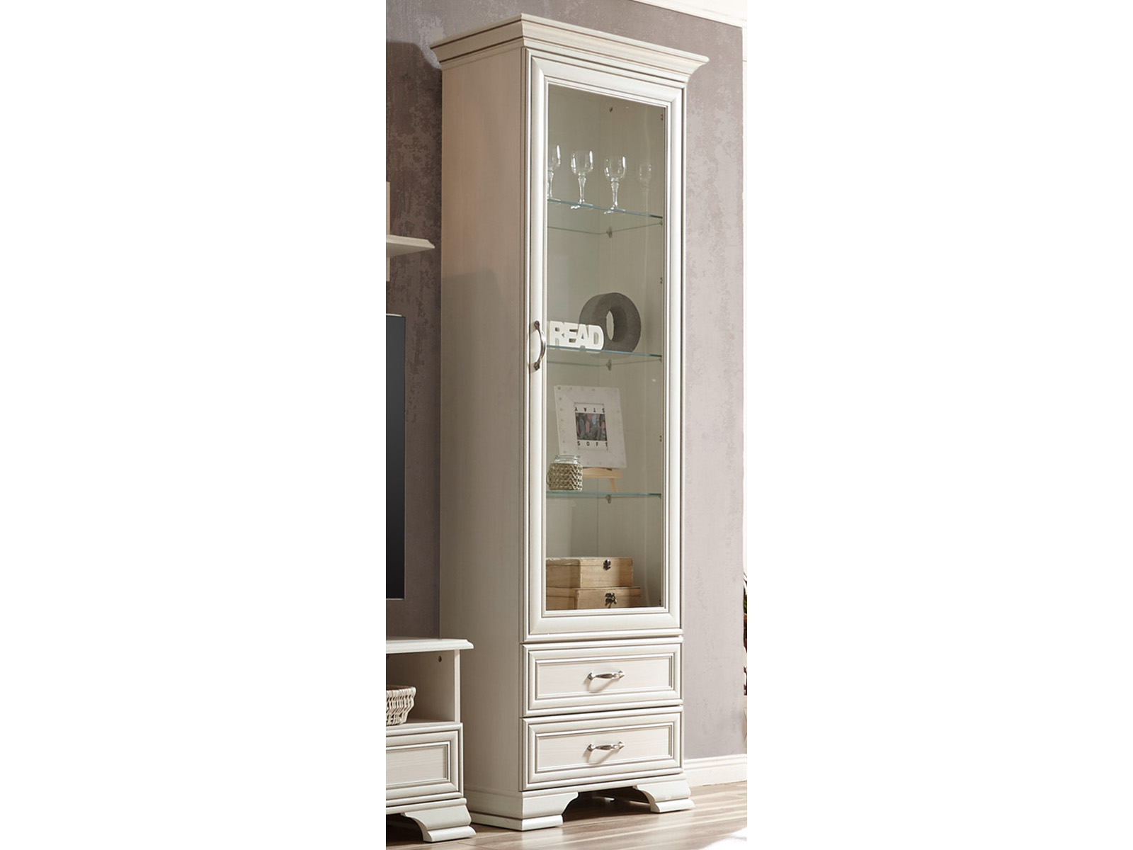 [metaDescription] => Vitrine im Landhausstil aus Spanplatte in Used White mit 1 Glas-/Holztür, 2 Schubkästen und 3 Glasböden Breite 69 cm, Höhe 212 cm, Tiefe 40 cm