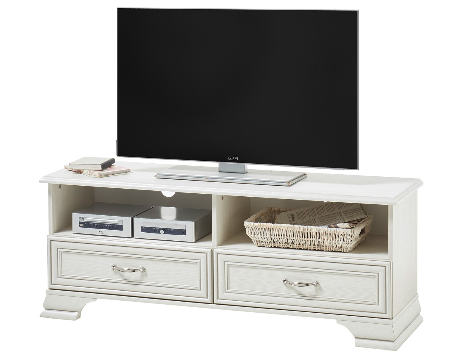 [metaDescription] => TV-Lowboard im Landhausstil aus Spanplatte in Used White mit 2 Schubkästen und 2 offenen Fächern Breite 130 cm, Höhe 51 cm, Tiefe 38 cm
