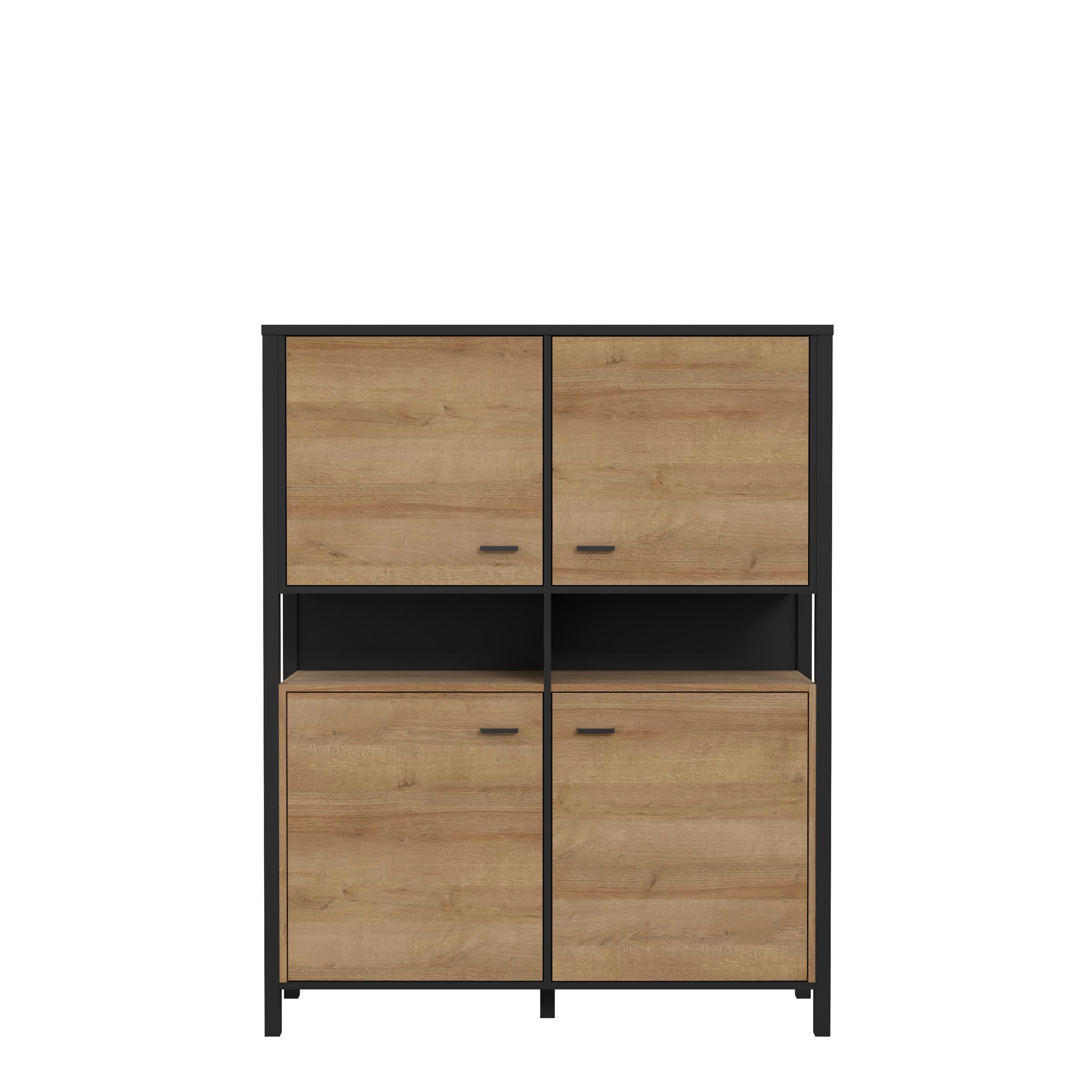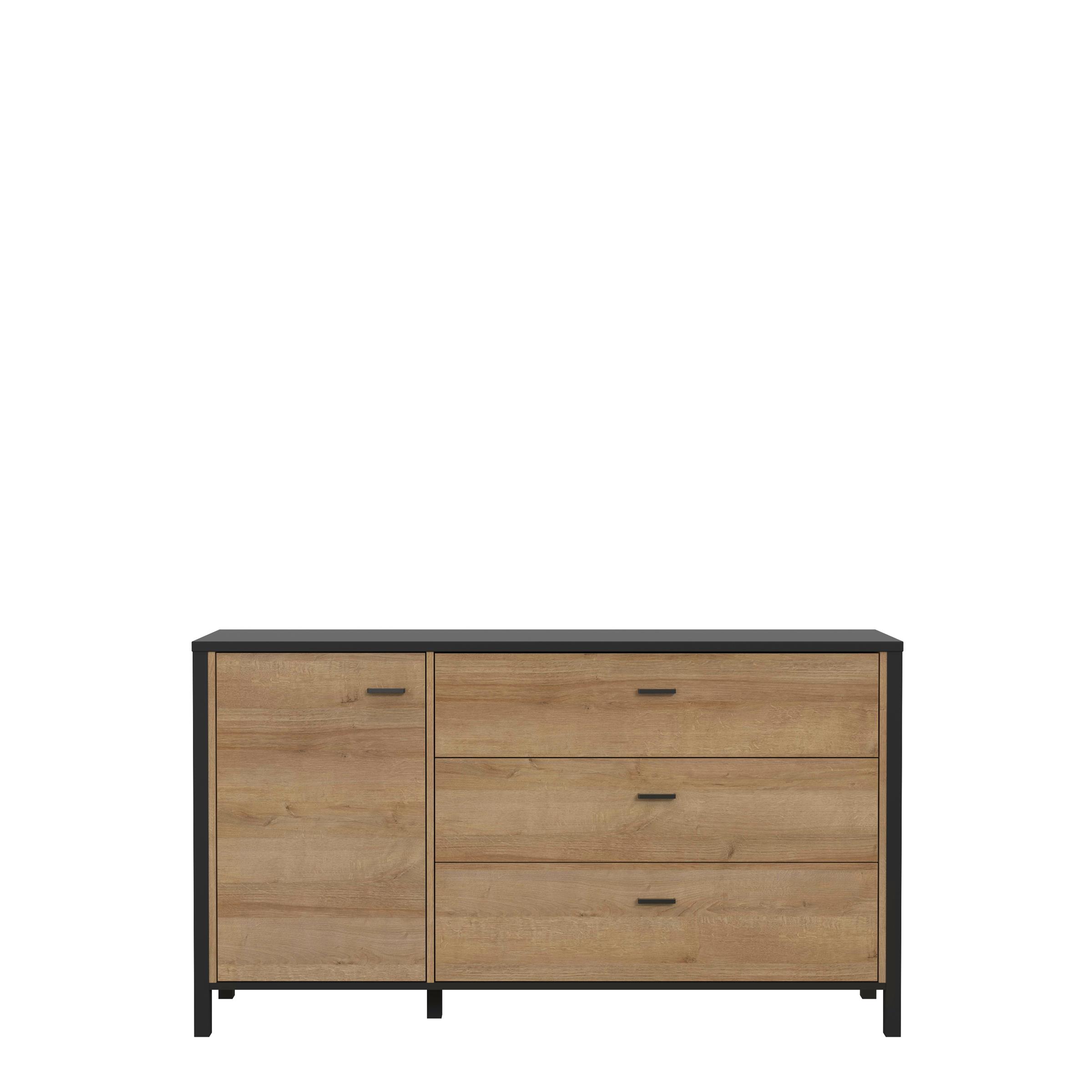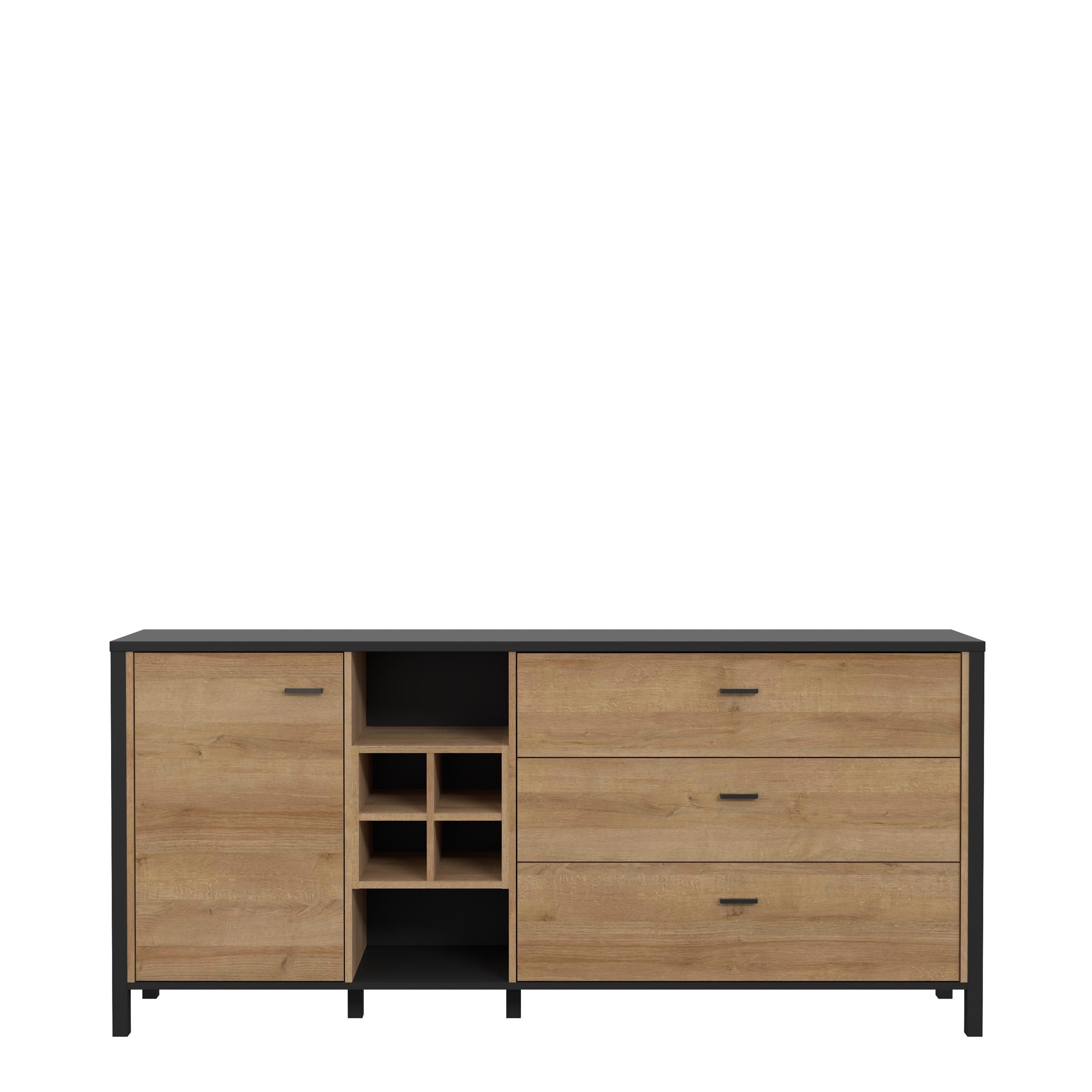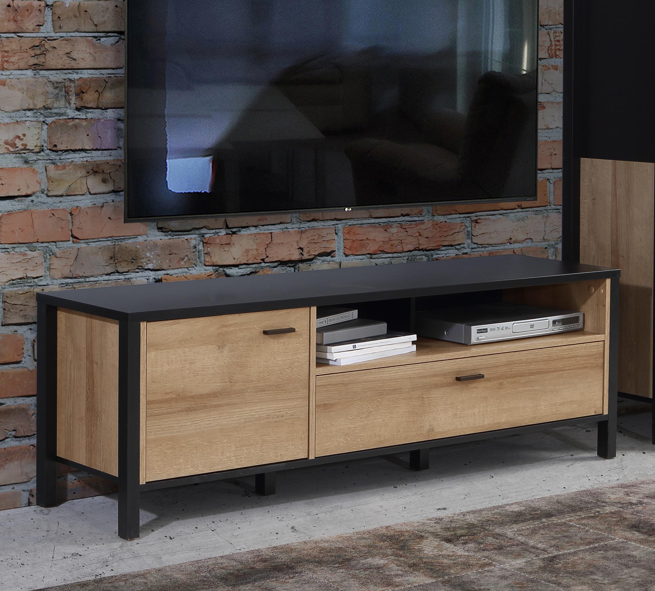Gestaltet im modernen Industrial-Design kombiniert "Hialeah I" einen schwarzen Korpus mit markanten Absetzungen in Riviera Eiche Nachbildung. Die hochwertige Holznachbildung mit täuschend echter Maserung sorgt für eine warme, natürliche Note, die sich hervorragend mit vielen Einrichtungsstilen verbinden lässt.