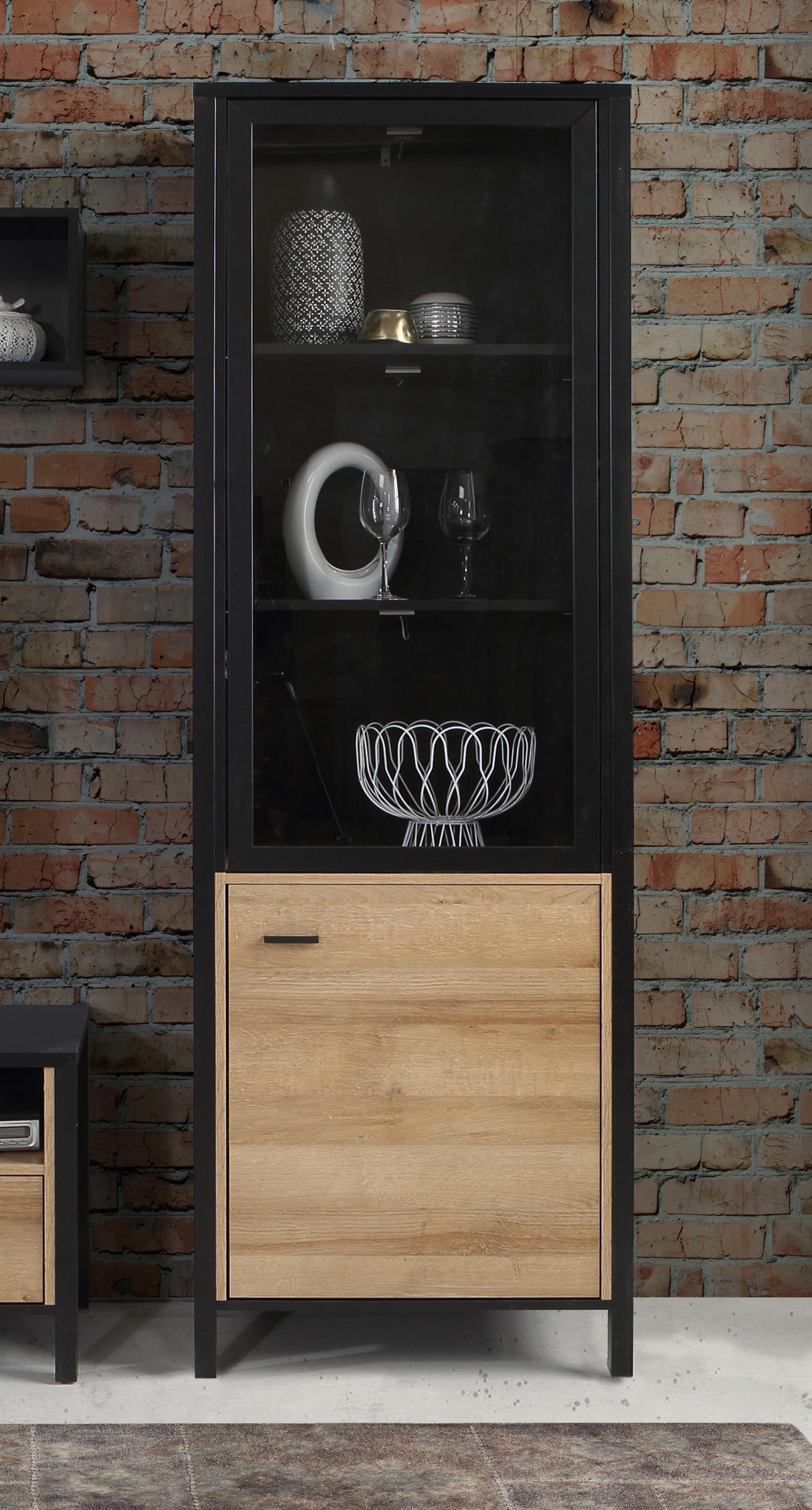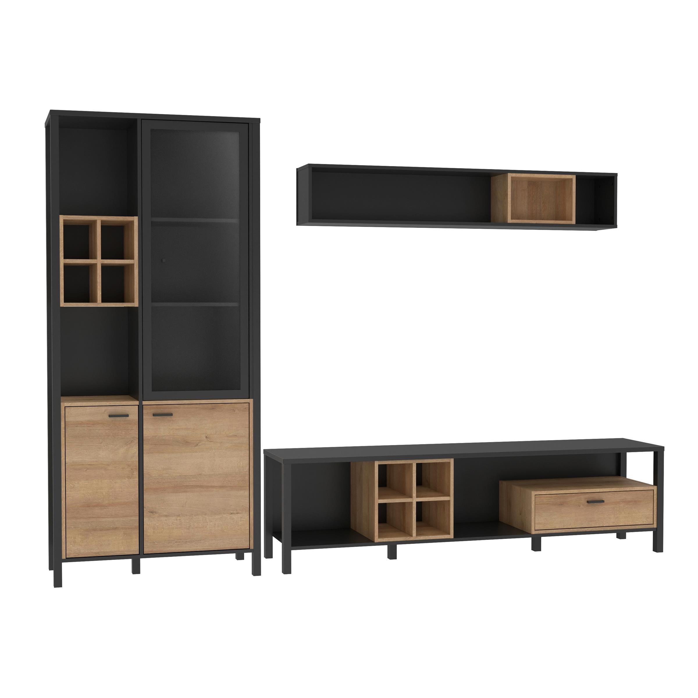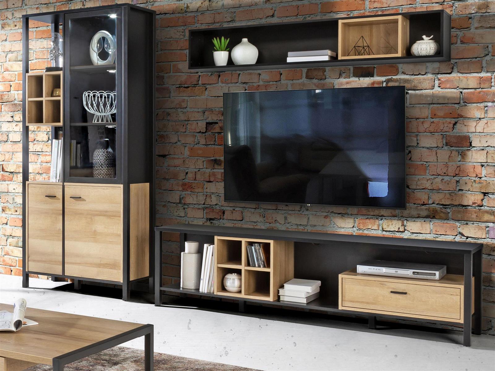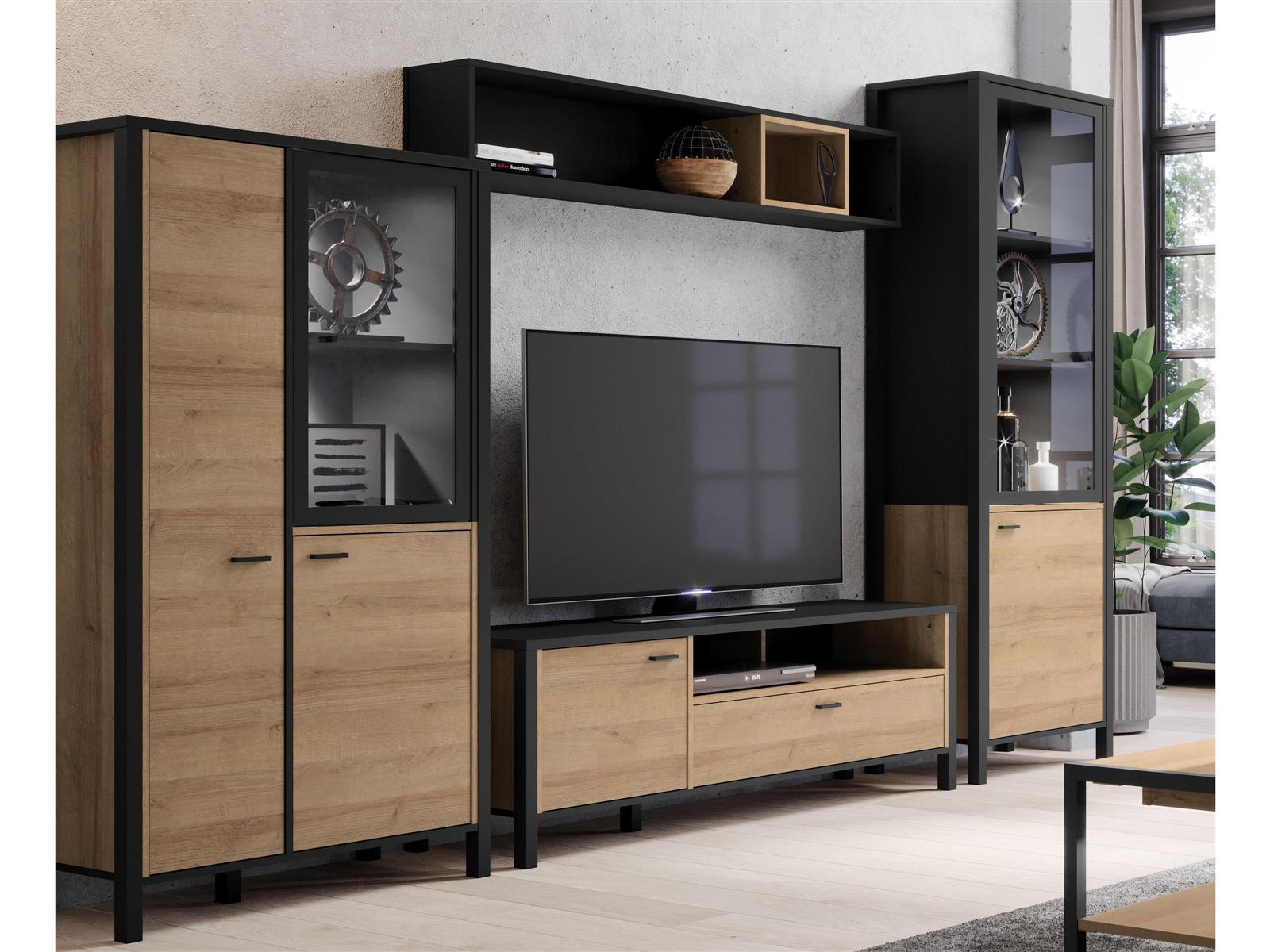 [metaDescription] => Wohnwand im Industrial-Design aus Spanplatte in Riviera Eiche Nachbildung, Gestell in Schwarz bestehend aus 2x Vitrine, 1 TV-Lowboard und 1 Wandboard Stellm