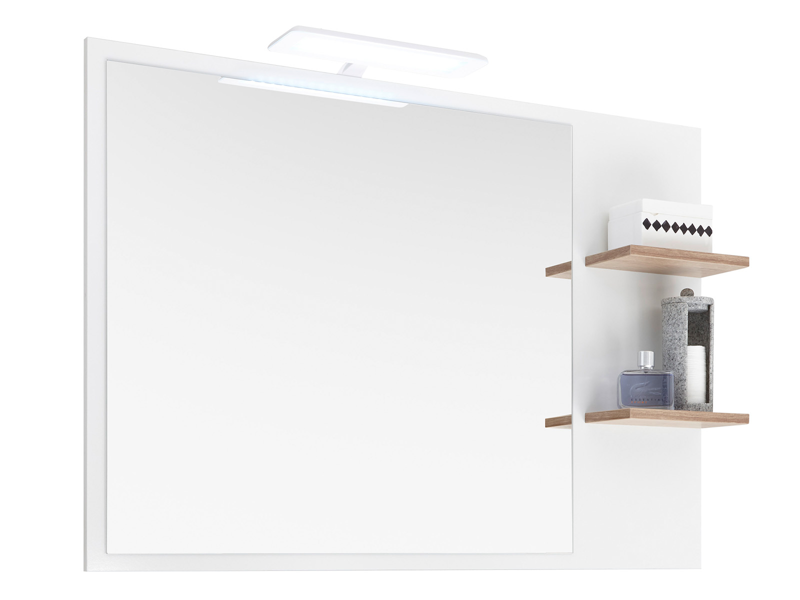 Der moderne Wandspiegel mit weiß-glänzendem Rahmen und praktischen Ablagen in Eiche Riviera quer Nachbildung fügt sich harmonisch in zeitgemäß gestaltete Bäder und Flure ein. Mit seiner großzügigen Spiegelfläche bietet er dir viel Platz für die tägliche Pflege und rundet deine Badeinrichtung optisch wie funktional ab.