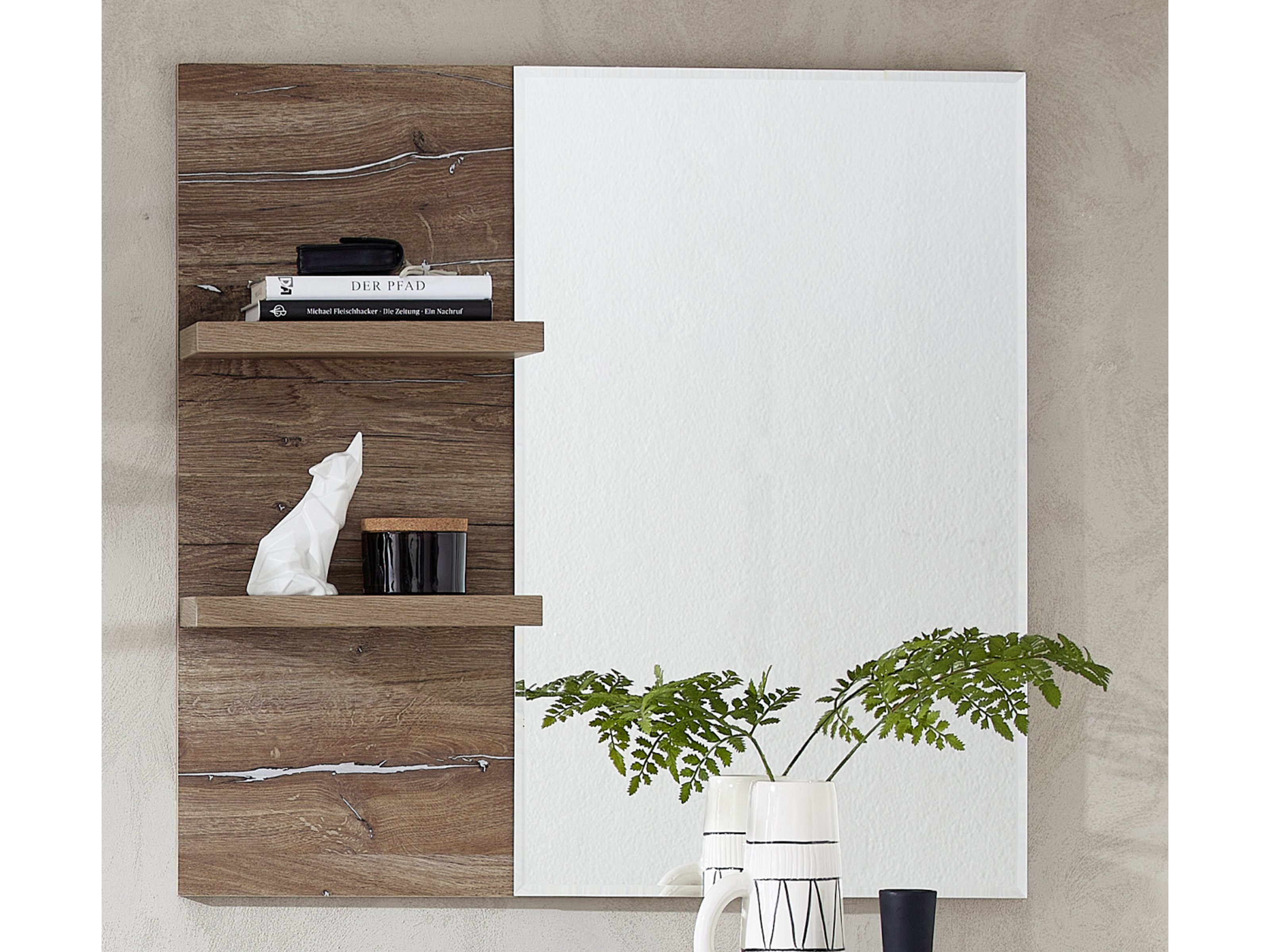 Gefertigt ist der Spiegel aus Spanplatte und Spiegelglas, die Front besteht vollständig aus Spiegelglas. Die Holzart ist als Nachbildung ausgeführt und harmoniert mit vielen modernen Möbelprogrammen. Farbhinweise und mögliche Abweichungen zum Monitorbild sind dabei zu beachten.