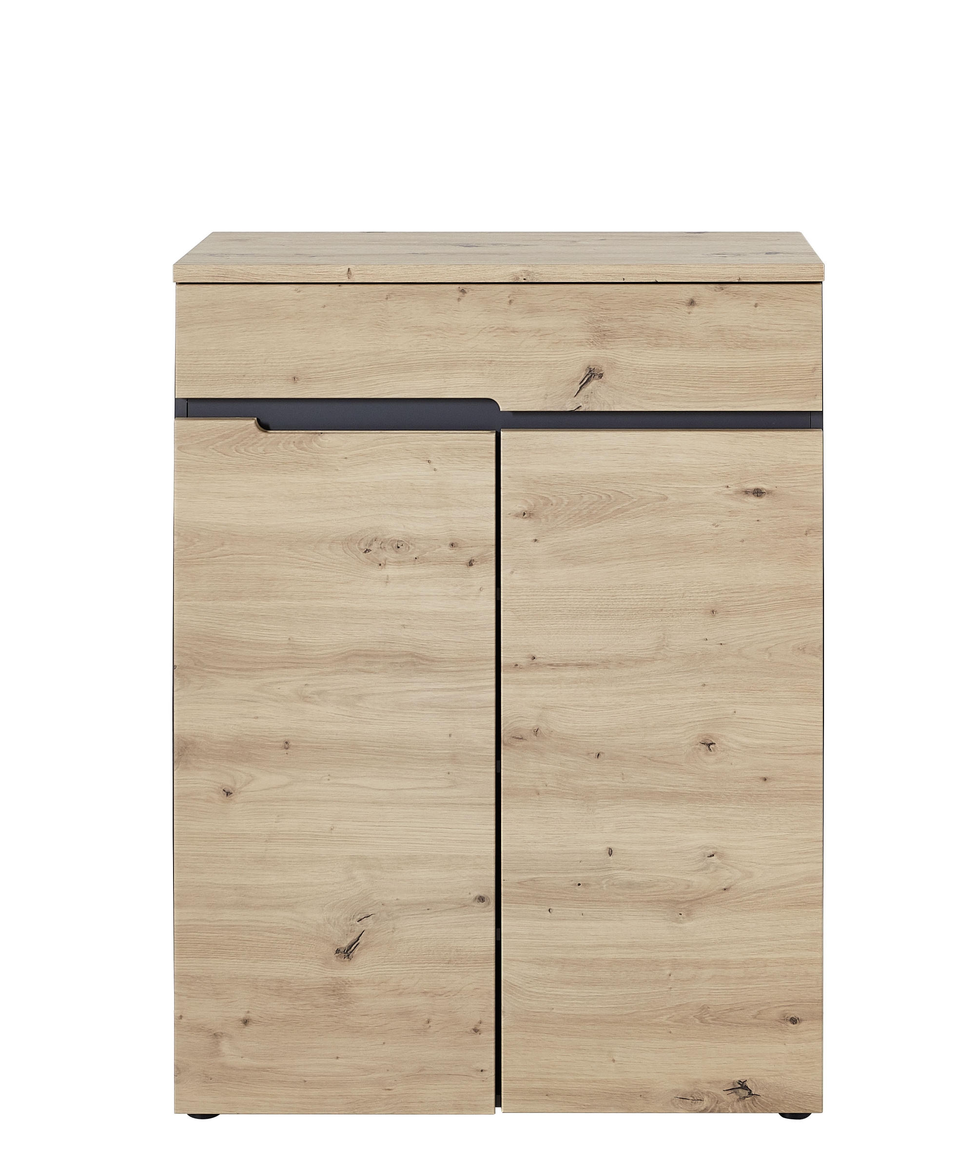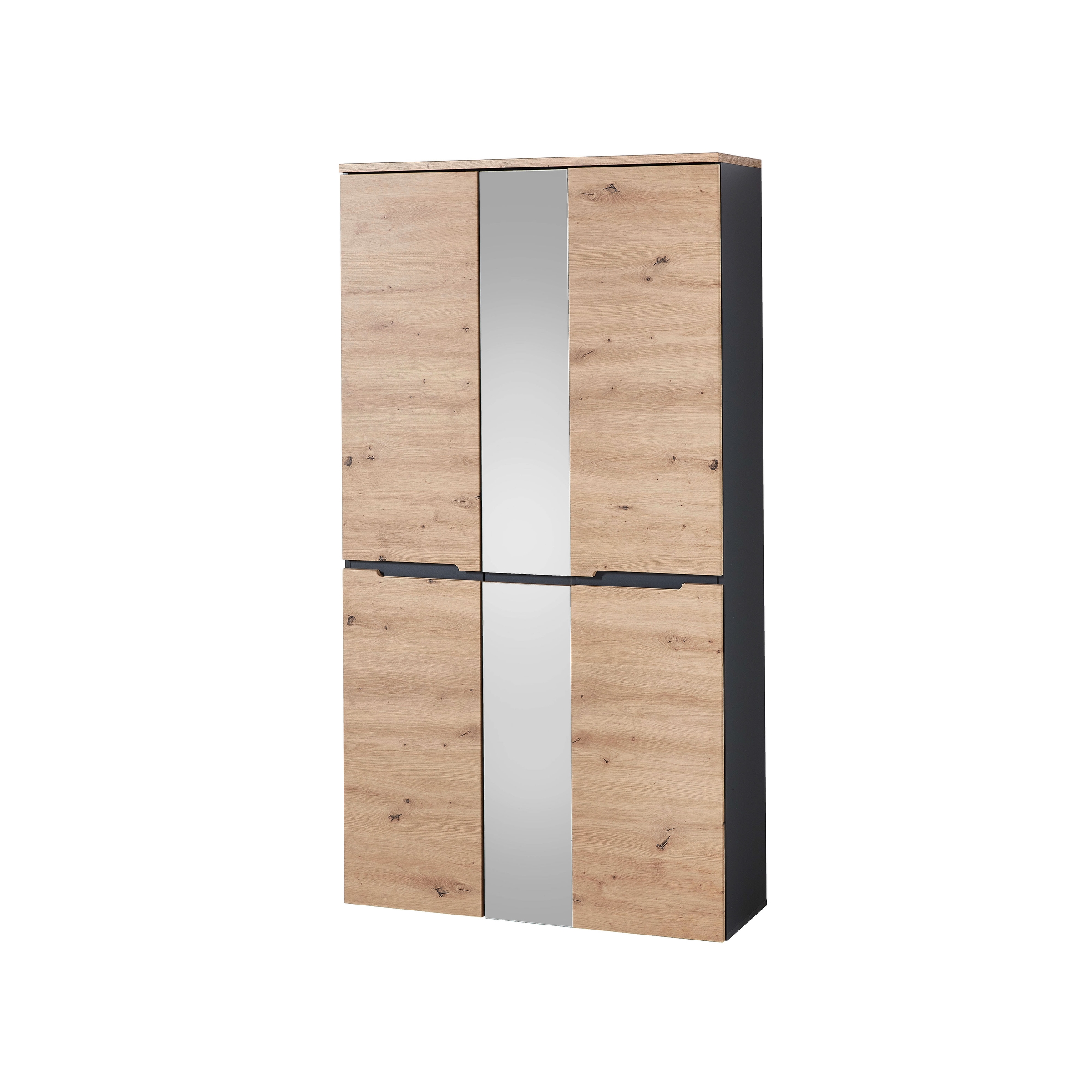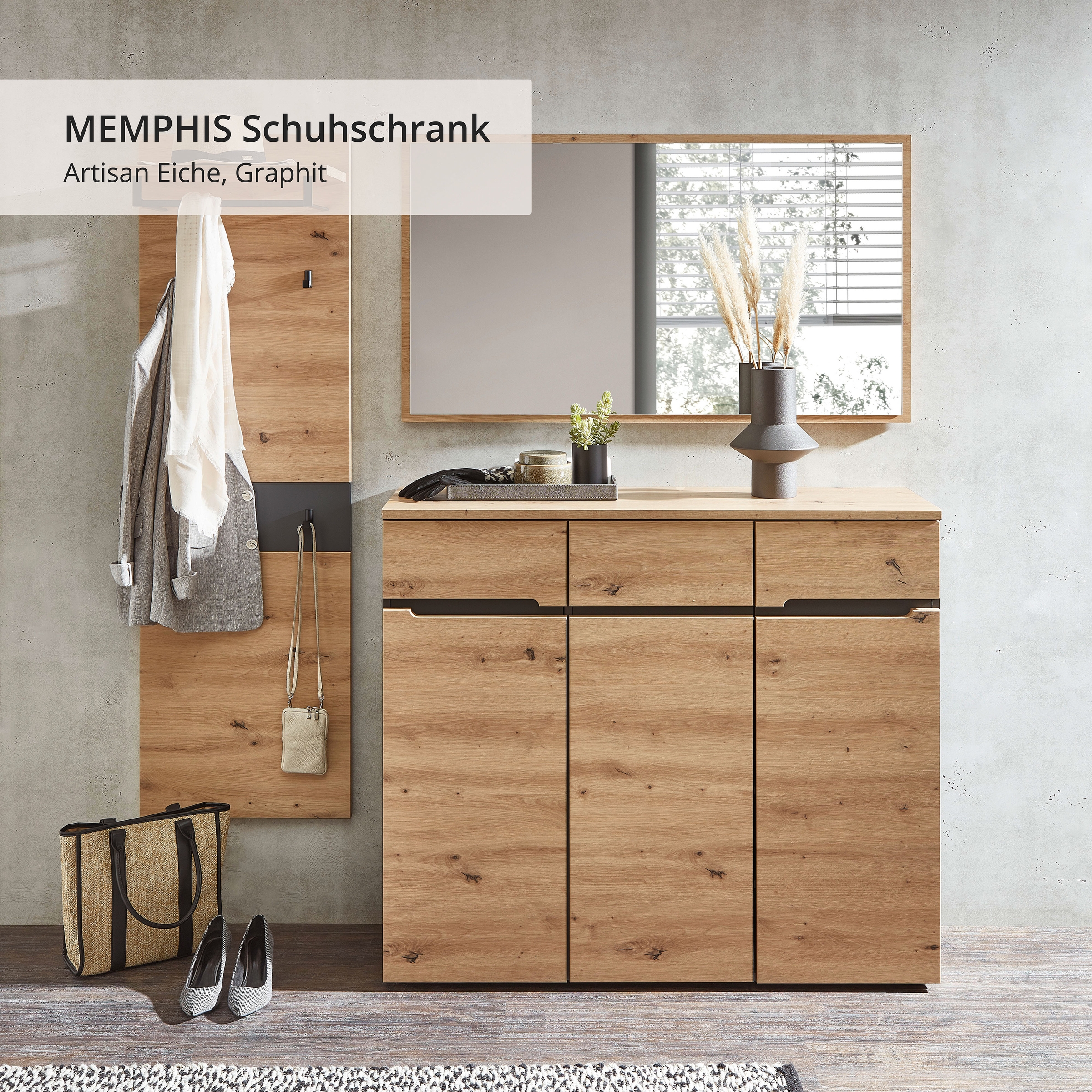 [cWert] => Moderner Schuhschrank;Korpus aus Spanplatte in Graphit;Front aus MDF in Artisan Eiche Nachbildung;mit 3 Holztüren und 8 Einlegeböden;Breite 120 cm, Höhe 107 cm, Tiefe 38 cm