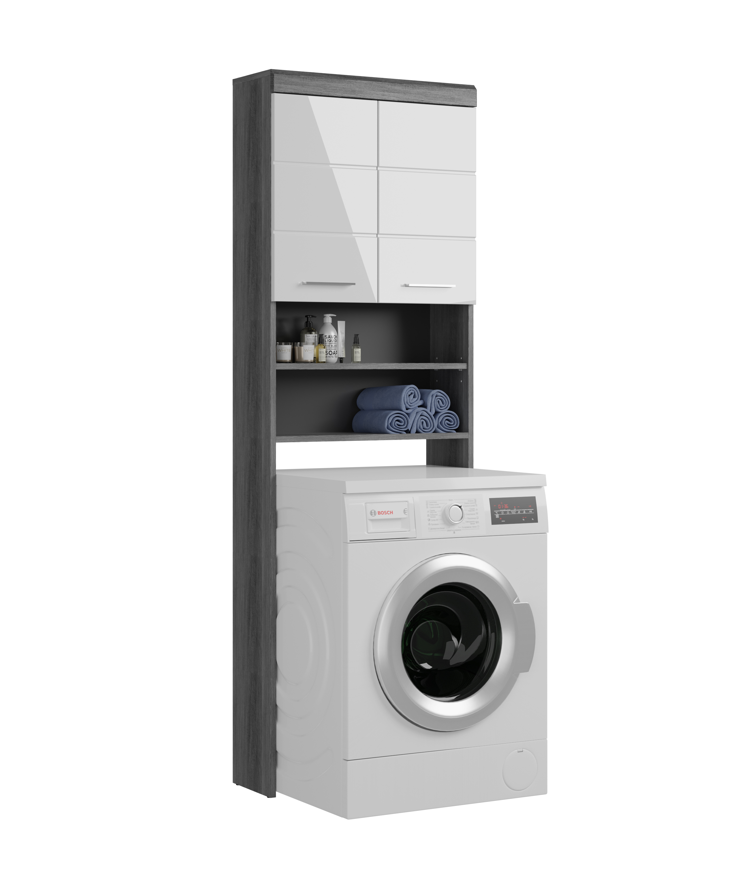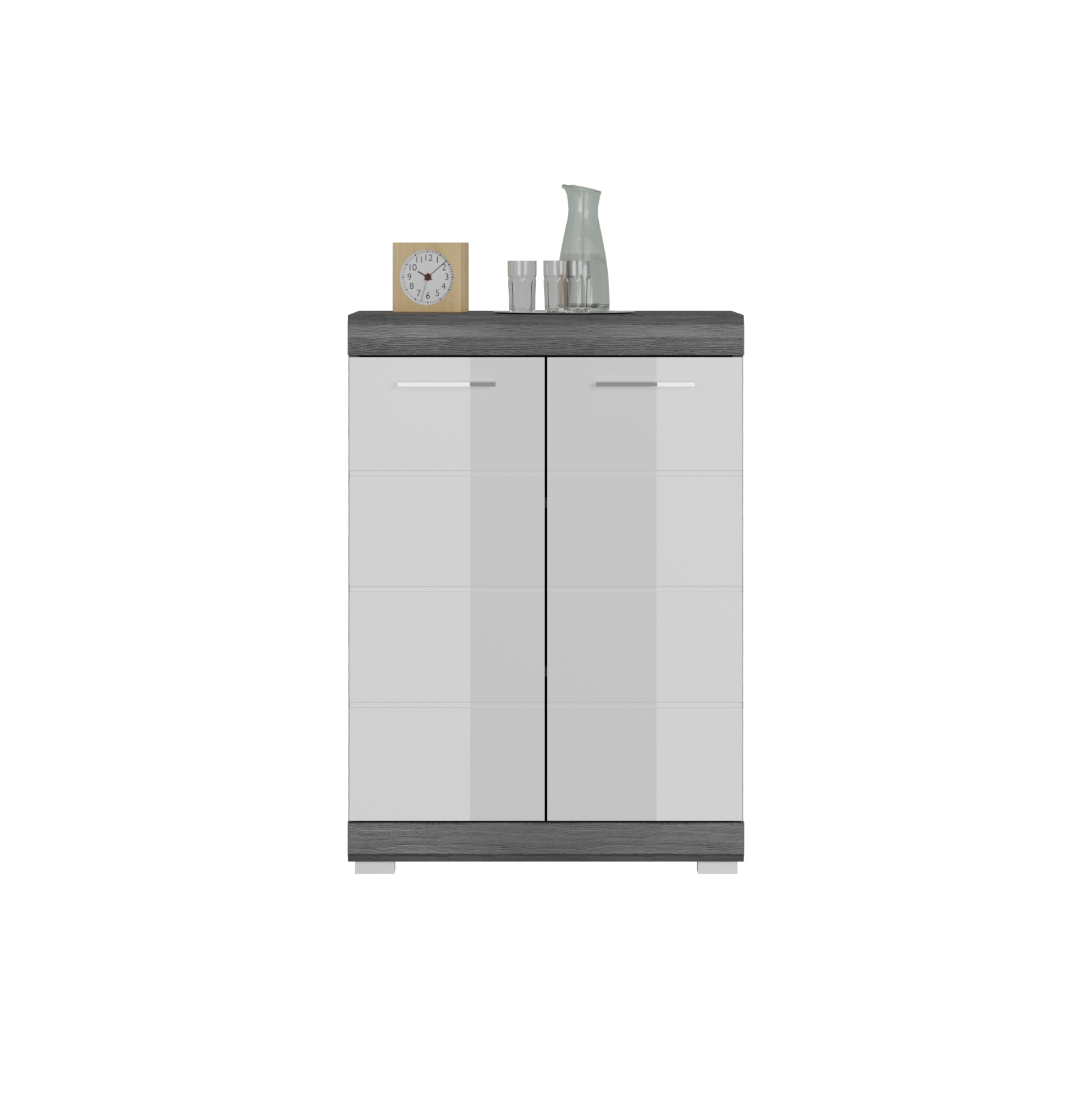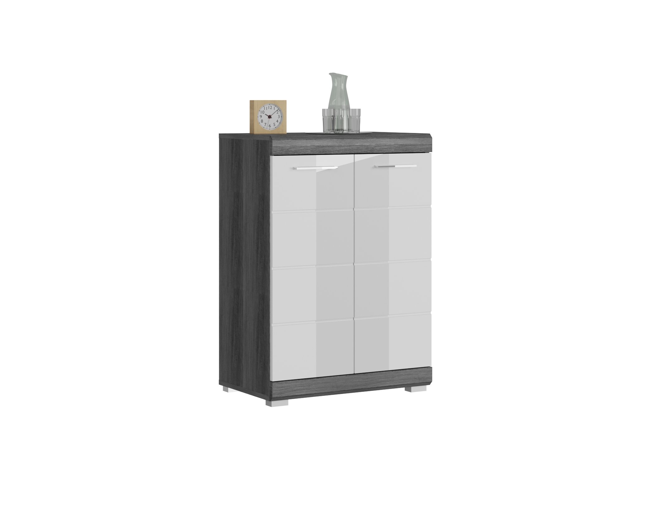 [metaDescription] => Moderner Waschbeckenunterschrank, Korpus aus Spanplatte in Rauchsilber Nachbildung, Front aus MDF in Weiß-Hochglanz mit 2 Holztüren und 1 Einlegeboden Breit