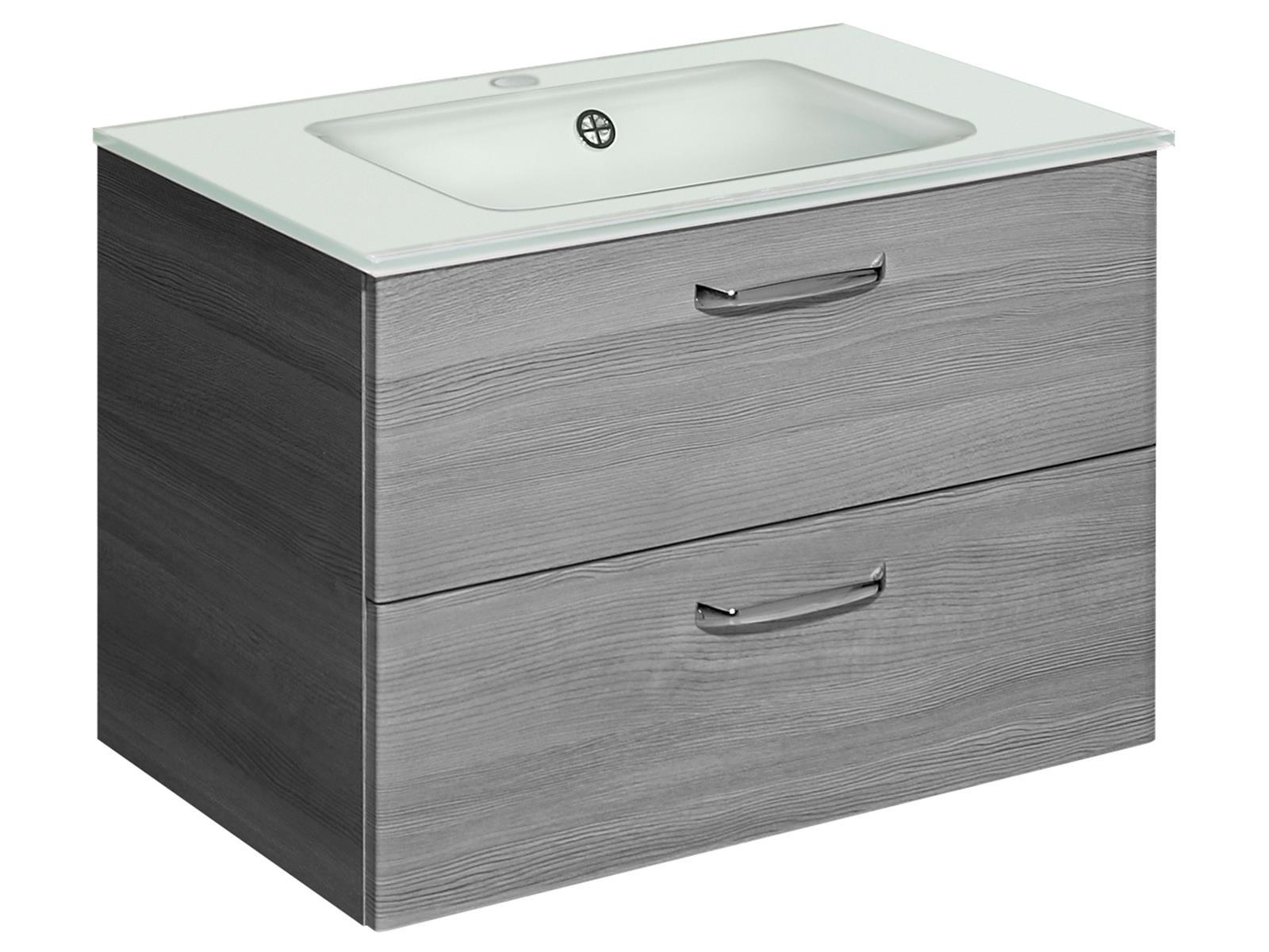 Mit diesem Waschtisch-Set von möbelando erhältst du eine moderne und zugleich funktionale Lösung für dein Badezimmer. Der Waschtischunterschrank in Graphit Struktur quer Nachbildung bietet dir dank seiner angenehm kompakten Abmessungen eine gute Raumnutzung, ohne den Raum zu überladen. Das im Set enthaltene Glaswaschbecken in Weiß rundet das Gesamtbild ab und setzt einen frischen, eleganten Akzent.