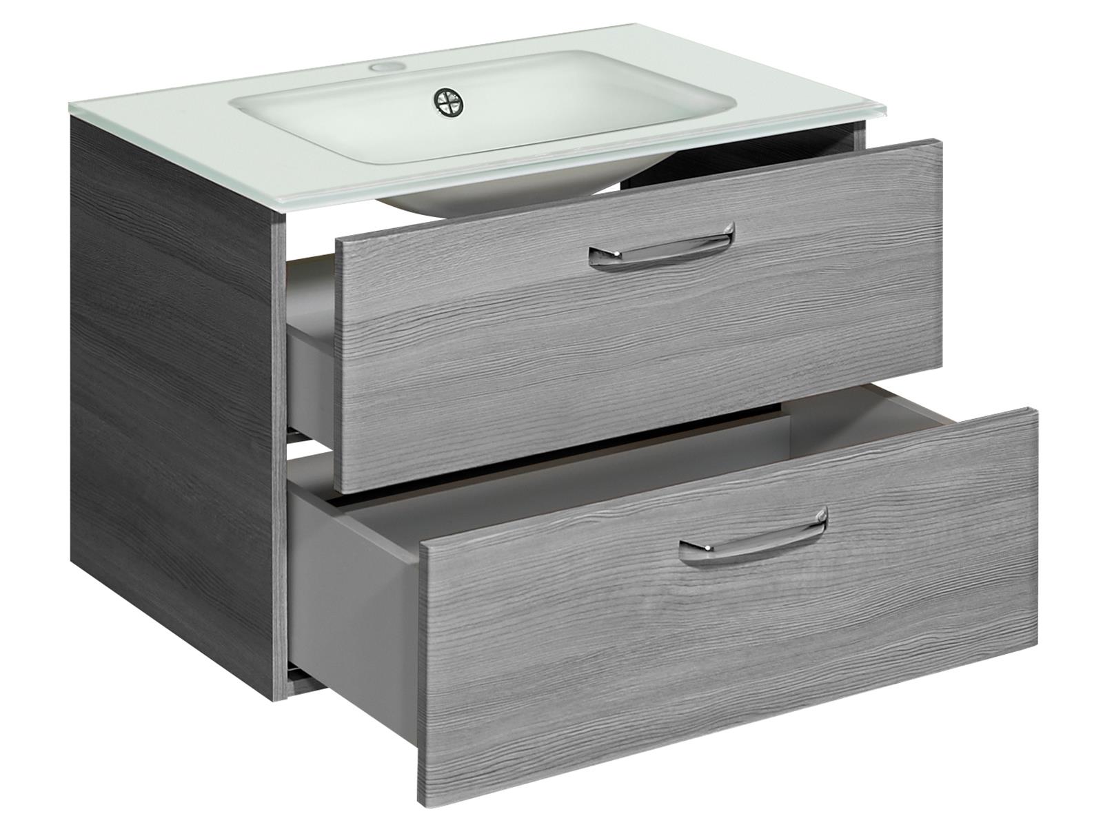 Das im Lieferumfang enthaltene Glaswaschbecken bildet das elegante Highlight des Sets und setzt mit seiner klaren, weißen Oberfläche einen edlen Akzent in deinem Badalltag. Zwei leicht zugängliche Auszüge bieten Platz für Pflegeprodukte, Handtücher und Badutensilien, sodass du alles schnell griffbereit hast.