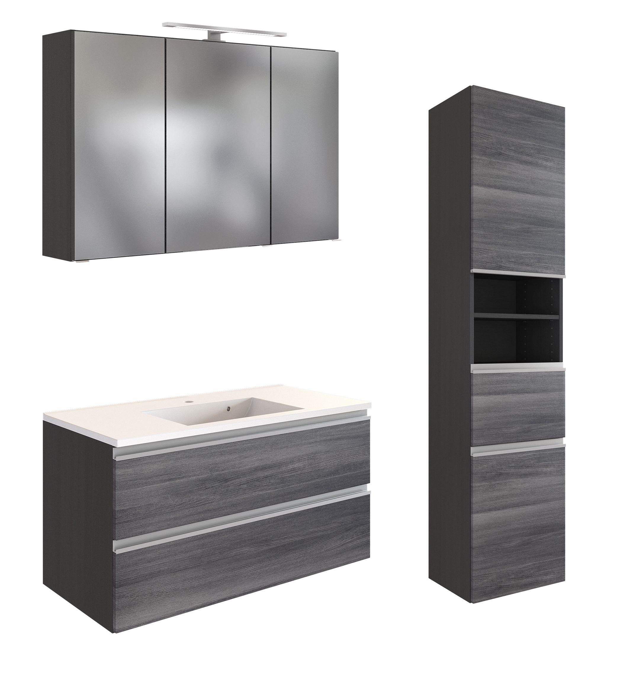 ✔Die Kombination aus Graphit-Korpus und Fronten in Eiche Rauchsilber Nachbildung bringt moderne Natürlichkeit in Ihr Bad.