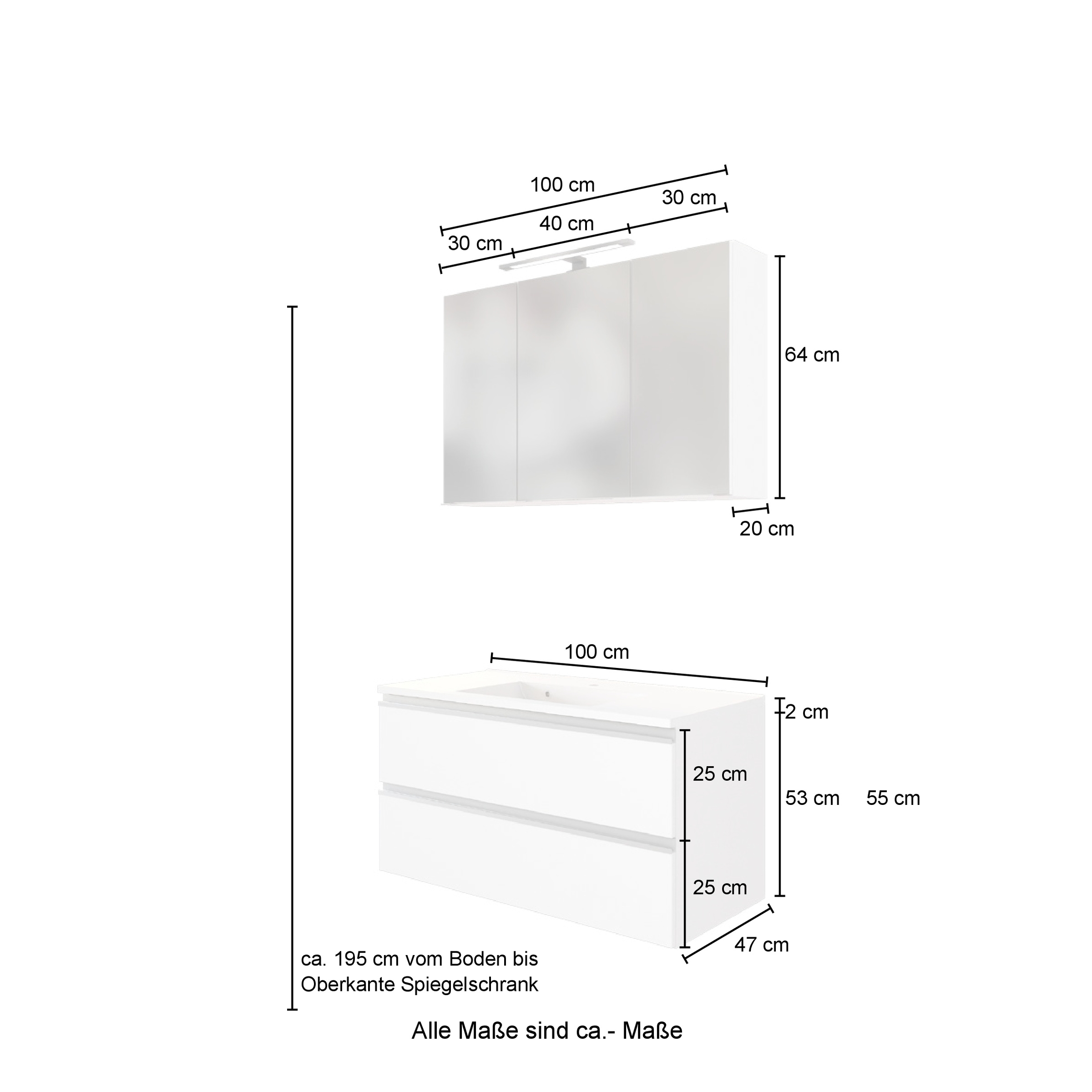 Ein Highlight sind die 2 Schubladenauszüge mit Softclose-Funktion, die sich leise und komfortabel schließen lassen und so den täglichen Gebrauch besonders angenehm machen. Das integrierte Mineralgussbecken rundet das Set ab und fügt sich harmonisch in die moderne Optik des Waschtisch-Sets ein.