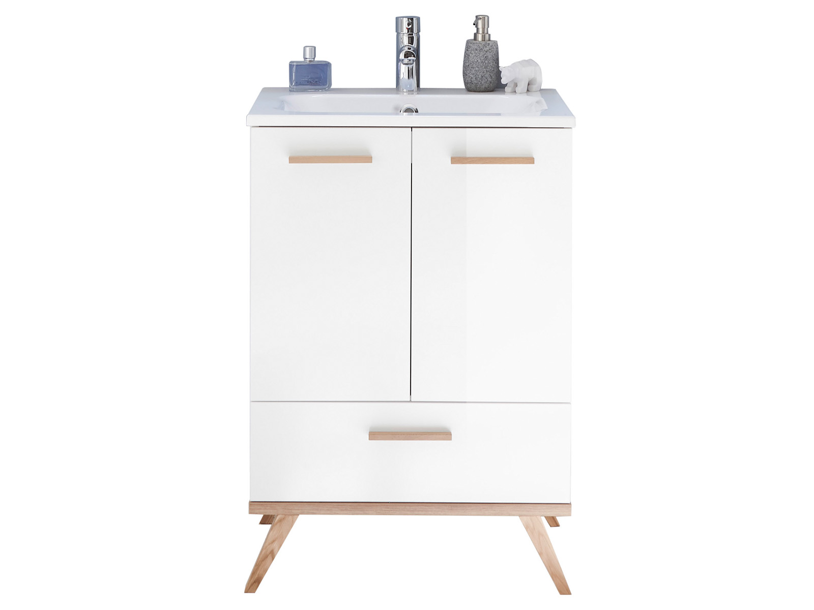 Der Unterschrank wird aus melaminharzbeschichteter Spanplatte mit 16 mm Materialstärke gefertigt und verfügt über eine 1,0 mm Kante am Korpus. Die glänzend lackierten Oberflächen in Weiß-Hochglanz unterstreichen den modernen Charakter und lassen Dein Bad heller und größer wirken. Füße und Griffe in Eiche Riviera quer Nachbildung sorgen für eine wohnliche Note und fügen sich harmonisch in einen modernen Einrichtungsstil ein.