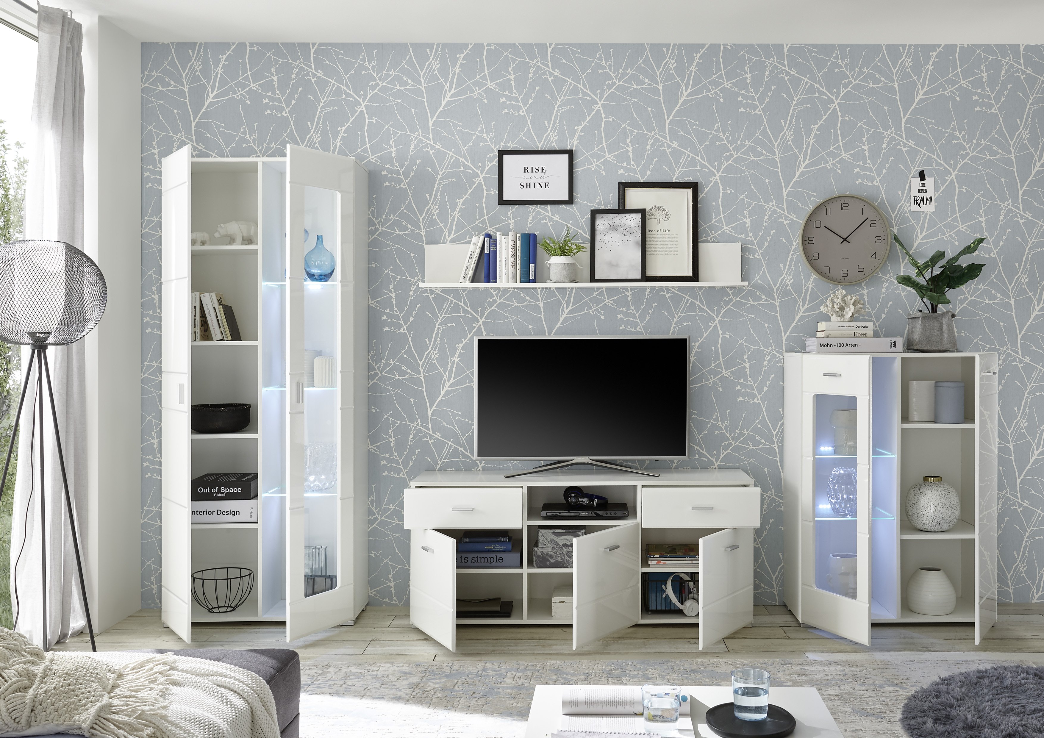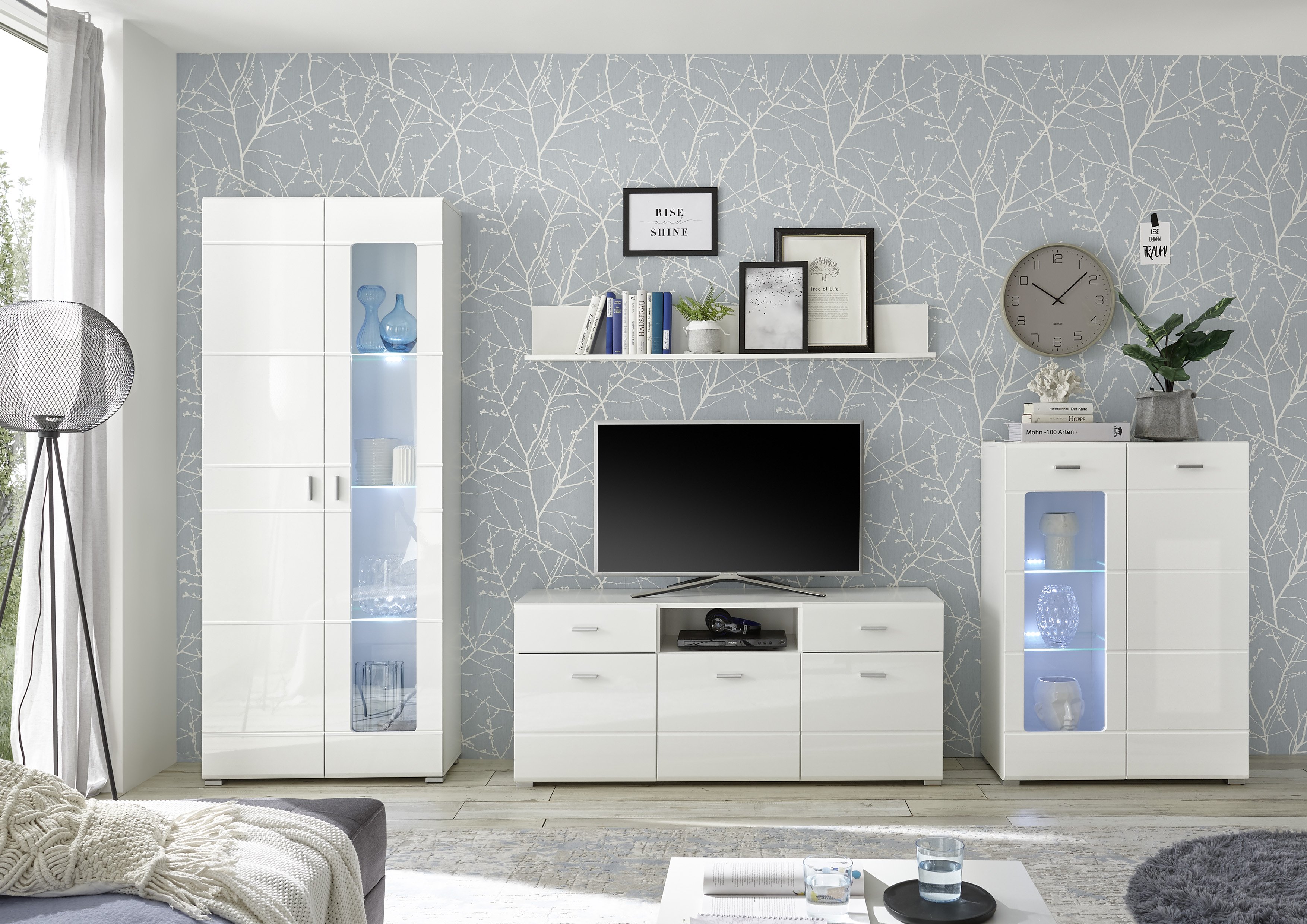 Ella Wohnwand – moderne Wohnwand mit Glasbodenbeleuchtung und viel Stauraum