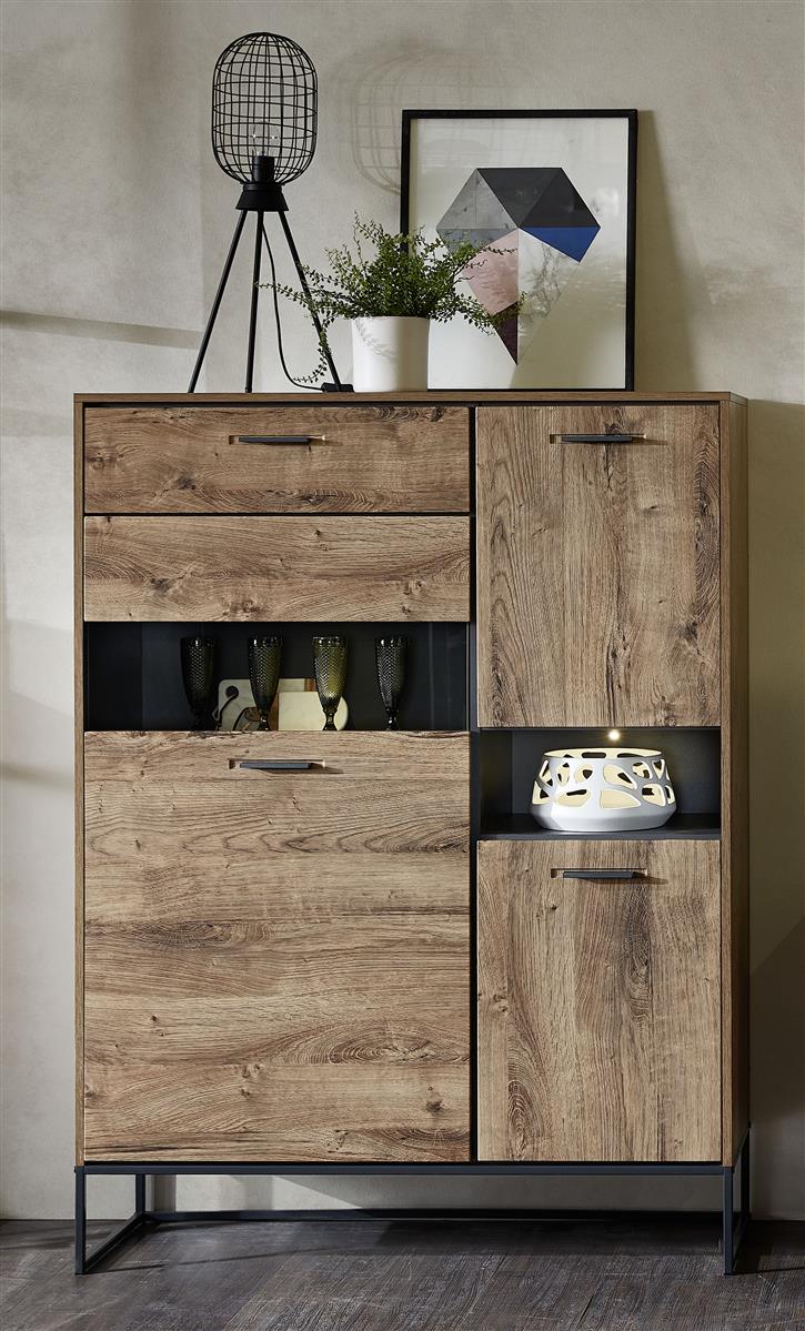 Optisch lebt "Manhattan II" von der edlen Kombination aus Haveleiche Cognac Nachbildung und graphitfarbenen Elementen. Der Korpus aus Spanplatte, die Fronten aus MDF, das Metallgestell, pulverbeschichtete Aluminiumgriffe in Anthrazitgrau und Klarglaseinsätze verbinden sich zu einem stimmigen, modernen Gesamtbild mit täuschend echter Holzmaserung. Auf Wunsch kannst du die passende LED-Beleuchtung ergänzen, um deine Lieblingsstücke in der Vitrine abends besonders atmosphärisch zu beleuchten.